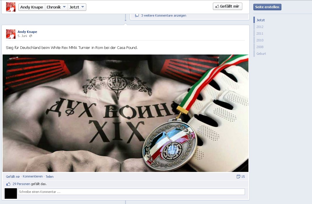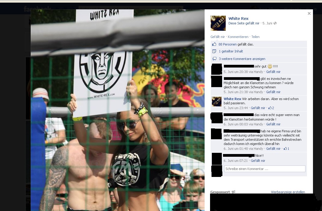 Vor wenigen Wochen veranstaltete die Marke dann ihr erstes Turnier in Europa, wohl in Zusammenarbeit mit dem faschistischen Jugend- und Kulturzentrum „Casa Pound“ in Rom. Zu Gast aus Deutschland war unter anderem Andy Knape, welcher Vorsitzender der NPD-Jugendorganisation JN ist und erst kürzlich wegen Körperverletzung zu einer Geldstrafe verurteilt wurde. Das Urteil ist noch nicht rechtskräftig. Knape, der sich in den vergangenen Wochen als Fluthelfer darstellte, postete auf Facebook über die Reise einer JN-Delegation zur Casa Pound. Wenige Tage später verkündete er den „Sieg für Deutschland“ beim Turnier von White Rex und postete dazu gleich ein Foto der Medallie. Die Marke selbst ließ verlauten, dass das erste europäische Turnier ein Erfolg gewesen sei und veröffentlichte ein sehr professionell gemachtes Video zu den Ereignissen in Rom. Doch nicht alle Fans der Marke werten das Turnier in Rom als Erfolg, so echauffieren sich einige YouTube-User unter einem weiteren, von der Casa Pound ins Netz gestelltem Video darüber, dass ein Mensch mit schwarzer Hautfarbe anwesend gewesen sein soll.
