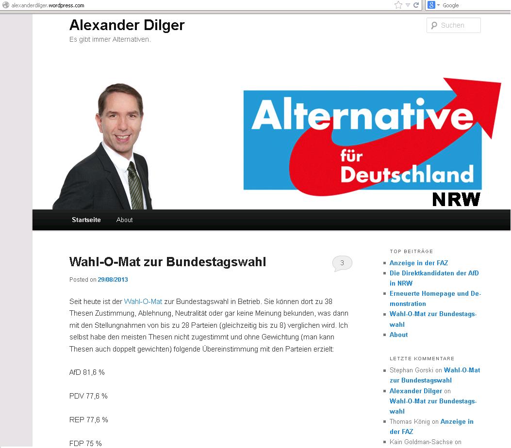 Alexander Dilger, Spitzenkandidat des AfD-Landesverbands Nordrhein-Westfalen zur Bundestagswahl, verkündet auf seiner Homepage den Wahl-O-Mat gemacht zu haben und laut diesem Präferenzen zur AfD, der verschwörungsideologischen PdV und zu den Republikanern zu haben. Damit bestätigt er indirekt die Kritik an seiner Partei.