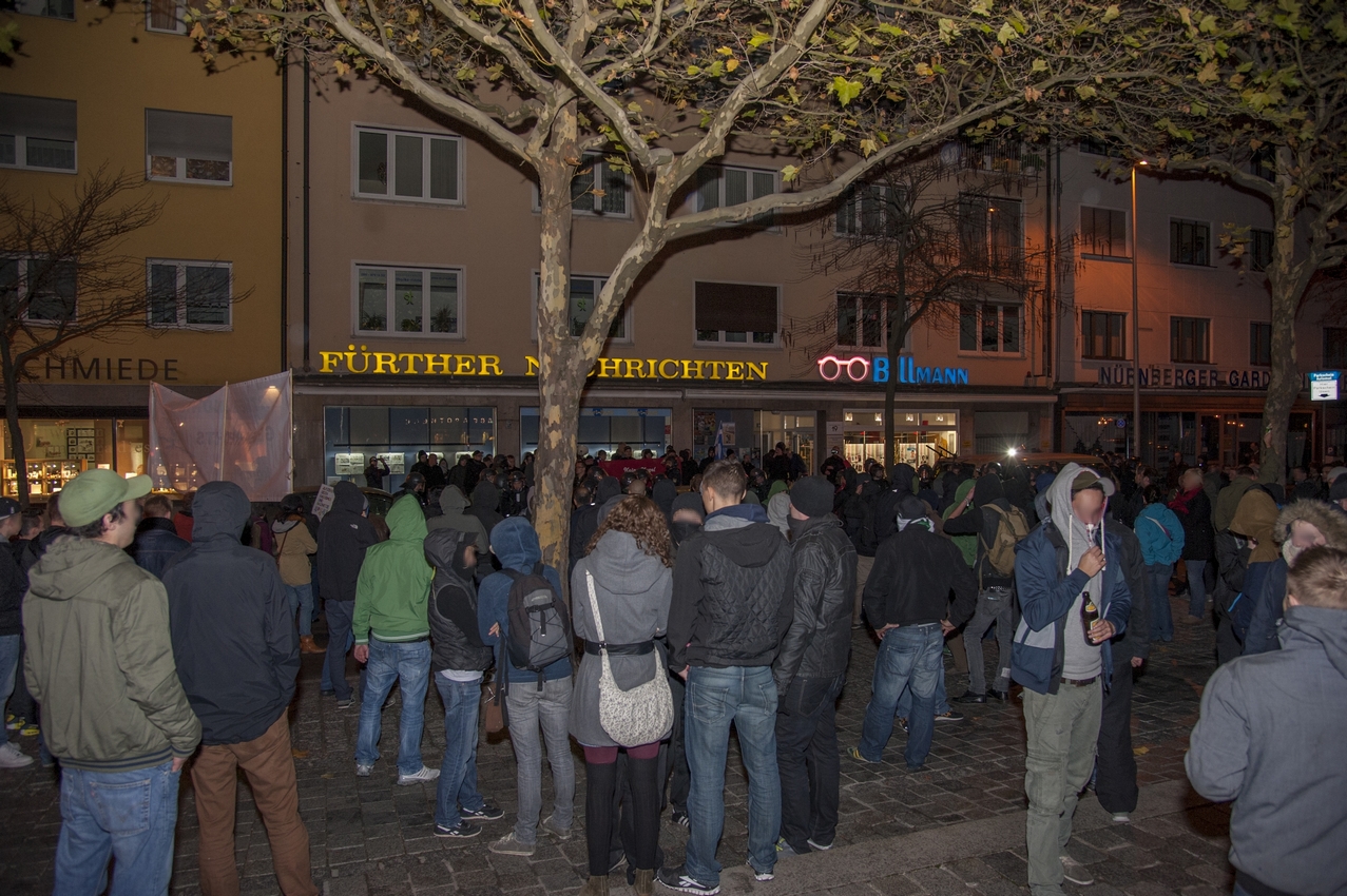 Am Samstagnachmittag meldete der Fürther Neonazikader Matthias Fischer vom Freien Netz Süd (FNS) die spontane Kundgebung für 21-22 Uhr an. Als Kundgebungsort war ursprünglich das alte Marktkaufareal in der Gabelsbergerstraße vorgesehen. Da schon kurz vor 21 Uhr über hundert Nazigegner diese Stelle besetzten, war es nicht mehr möglich die Kundgebung dort abzuhalten. Als sich die eintreffenden Neonazis in Richtung Gegendemonstranten aufmachten, wurden sie von Nazigegnern vor der Geschäftsstelle der Fürther Nachrichten gestoppt und eingekesselt. Die Polizei hatte Mühe, die verfeindeten Gruppen auf Abstand zu halten. Die Neonazis stellten sich auf, entrollten ein Transparent mit der Aufschrift „Keine Kugel stoppt eine Idee, deren Zeit gekommen ist“ mit dem, an ein Hakenkreuz angelehntes Parteisymbol, der griechischen Neonazipartei Chrysi Avgi (Goldene Morgenröte).