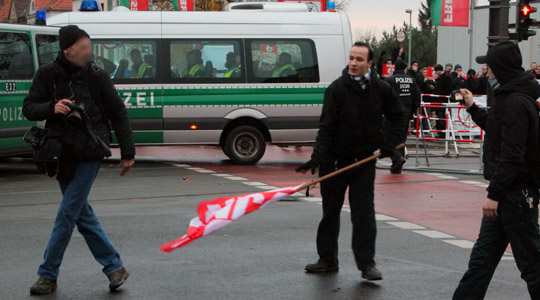 Die Bilderstrecke aus Sicht des betroffenen Fotografen zeigt den Vorfall deutlich: Der Neonazi stürmt mit seiner JN-Fahne aus dem Aufzug gezielt auf den Journalisten zu, holt mit dem Stock aus und schlägt zu. Nach der Attacke kann er ungestört in den Marsch zurückkehren, ein einzelner Bereitschaftspolizist spricht lediglich allgemein in die Menge und hebt beschwichtigend die Hand.