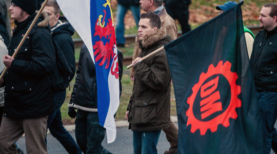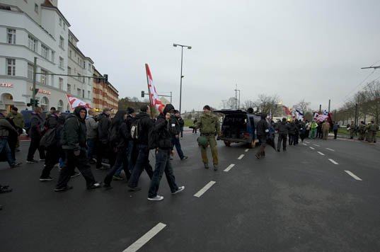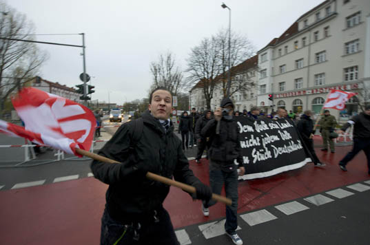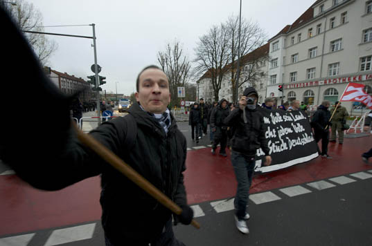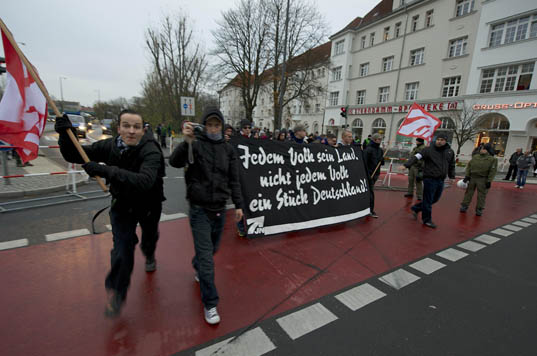 Erst drei Tage vor dem Aufmarsch wurde dann auch öffentlich mobilisiert. Unbeholfen wurde in dem Aufruf der Angriff auf Wild mit der Forderung nach „nationalen Freiräumen“ vermengt, in dem sonst vor allem rassistisch argumentiert wird. Der Versuch über die Attacke auf eine ihrer Führungsfiguren mit Schlagworten wie „Angriffe nehmen wir persönlich“ und „kämpferische Demo“ die szeneinterne Mobilisierung für eine sonst belanglose Demonstration anzukurbeln ist überdeutlich, hatte jedoch jenseits von virtuellen „Facebook-Likes“ kaum Resonanz auf der Straße. Das überrascht insoweit, da sogar der bekannte Neonazi-Querulant Christian Worch mit seiner Parteiabspaltung „Die Rechte“ über seinen Schatten sprang und zu einem Marsch der NPD-Jugend aufrief. Solidarität wird bei Rechtsextremen aber offenbar weiterhin nicht großgeschrieben: Nur 150 Neonazis aus Berlin, Brandenburg und Mecklenburg-Vorpommern erschienen am S-Bahnhof Schöneweide. Auch ein Anhänger der tschechischen DM (Dĕlnická mládež, „Arbeiterjugend“, Nachwuchsorganisation der rechtsextremen DSSS) war mit Fahne erschienen.