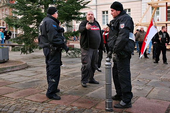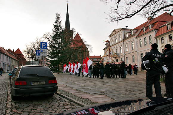 In der brandenburgischen Kleinstadt Bad Freienwalde an der Oder führten am Sonnabend, den 04.01.2014, rund 55 Neonazis eine Kundgebung gegen eine geplante Flüchtlingsunterkunft, auf dem örtlichen Marktplatz, durch. Angemeldet wurde dies von der rechts-populistischen Partei „Die Rechte“ um den ehemaligen Funktionär der „Deutschen Volksunion“, Klaus Mann. Er versammelte ungefähr 55 Neonazis, darunter auch Ex-Funktionäre des verbotenen „Frontbann 24“ aus Berlin, Mitglieder der scheinaufgelösten „Kameradschaft Märkisch-Oder-Barnim“ (KMOB) und den „Freien Nationalisten Uckermark“ sowie einzelnen NPD- und JN Aktivisten.
