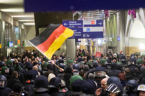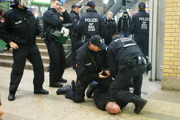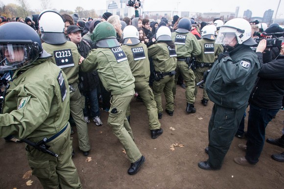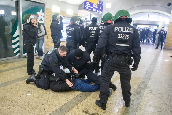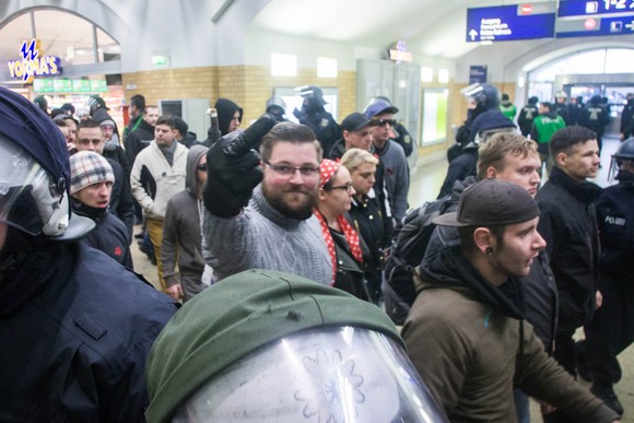 Gleich mehrere rechte Gruppen hatten sich ausgerechnet den diesjährigen 9. November als Datum für Versammlungen in Berlin ausgewählt. Während am Alexanderplatz rechte Hooligans und Neonazis aufmarschieren wollten, mobilisierten neurechte „Friedensaktivisten“ und Reichsbürger zu Kundgebungen im Regierungsviertel. An beiden Orten kam es zu gewalttätigen Zwischenfällen. Ein kleiner Überblick.Wie berichtet, hatte Steven K., ein Anhänger des BFC Dynamo und NPD-Sympathisant eine Demonstration für 80 Personen unter dem Motto „Das deutsche Volk wehrt sich” angemeldet, die sich „gegen das System der Salafisten & Flüchtlinge“ richten sollte. Im sozialen Netzwerk Facebook hatten sich 200 Teilnehmer angekündigt. Ganz offen bezog sich die Veranstaltung auf die „HoGeSa“. Doch zu einem Aufmarsch kam es nicht, da der Anmelder am Sonntagvormittag die Veranstaltung selbst absagte. Gründe sind nicht bekannt, aber es scheint, als stießen die Pläne von K. auf vereinsinterne Kritik. Die Fanvereinigung „Black Boys Dynamo“, als deren Chef sich K. bezeichnete, distanzierte sich in einem Schreiben von seiner geplanten rechtsradikalen Demonstration und entschuldigte sich bei Verein und Fangruppen.