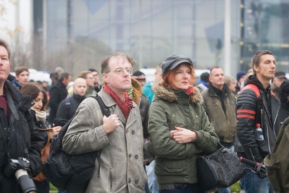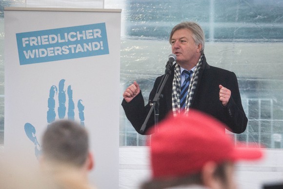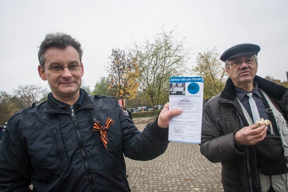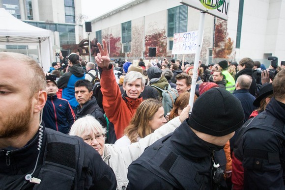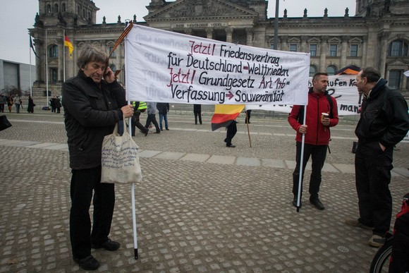 Direkt daneben fand zeitgleich eine Kundgebung von neurechten „Friedensaktivisten“ statt, die sich von den „Montagsmahnwachen für den Frieden“ abgespalten hatten, da ihnen die dort vertretenen Thesen zu lasch waren. Mit ihren diversen Verschwörungstheorien standen sie den Reichsbürgern wenige Meter entfernt inhaltlich näher, als sie zugeben wollten. Das sahen auch die Teilnehmer so, die mitunter zwischen beiden Veranstaltungen hin und her wanderten. Aus demselben Kreis wurde zudem eine Kundgebung vor dem Kanzleramt durchgeführt. Mit ca. 80 Personen war allerdings lediglich ein Bruchteil der angemeldeten 1500 Teilnehmenden erschienen, die vor allem auf die Rede ihres Vordenkers Jürgen Elsässer warteten, der in seiner Rede unter anderem eine Lanze für die „HoGeSa“ brach. Auch hier fanden sich diverse Verschwörungstheorien und die Leugnung der Existenz der Bundesrepublik. Diese Inhalte lockten auch bekannte Neonazis aus der NPD an: Die Parteifunktionäre Karl Richter und Sigrid Schüßler waren dafür offenbar extra aus München angereist. Auch hier versuchten Gegendemonstranten mit Sprechchören die ein Zeichen gegen die rechte Ansammlung zu setzen, bis Polizisten die Gruppe abdrängte.