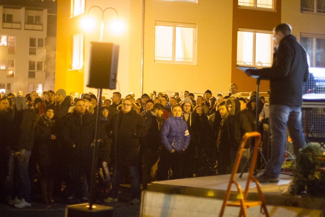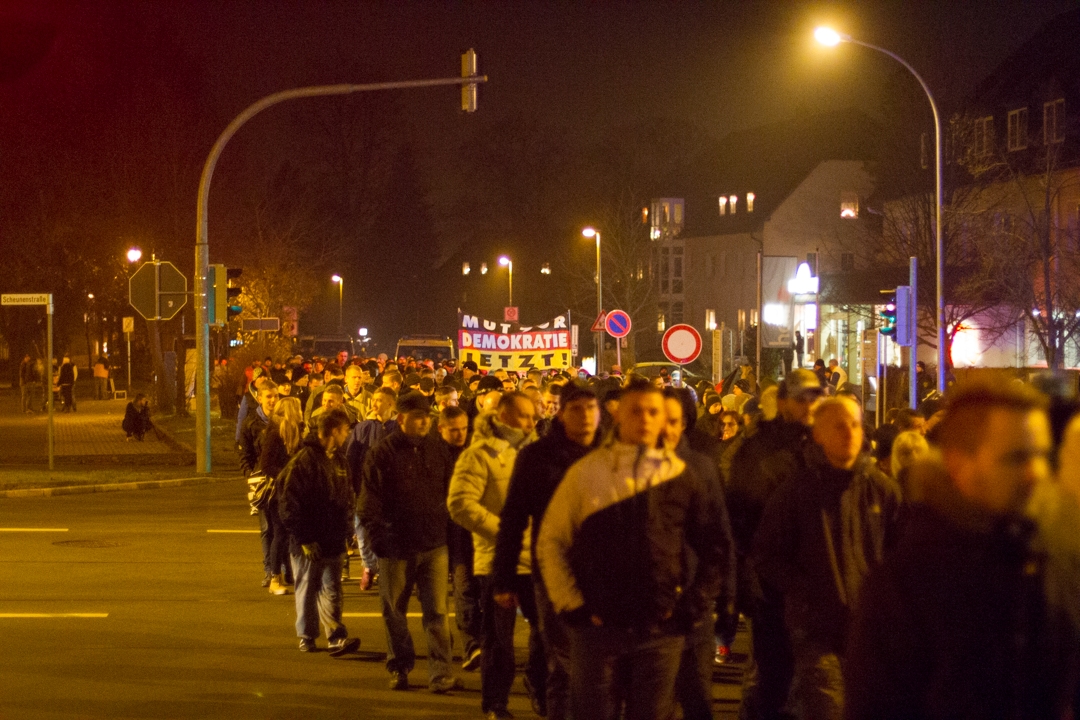 Der Aufmarsch war eine Neuauflage der im Vorjahr durchgeführten „Lichtelläufe“ und stand abermals unter der Führung des NPD-Politikers Stefan Hartung, der dem NPD-Kreisverband Erzgebirge vorsitzt. Im vergangenen Herbst und Winter hatte seine Initiative „Schneeberg wehrt sich“ fünf Demonstrationen durchgeführt. Den hauptsächlich bei Facebook verbreiteten Aufrufen waren damals bis zu 1800 Personen auf die Straße gefolgt, am letzten Aufmarsch im Januar dieses Jahres beteiligten sich noch 300 Personen. Ein Novum der vergangen Jahre war dabei, dass zahlreiche Bürger_innen gemeinsam mit der NPD und militanten Kameradschaften auf die Straße gingen. Aufgrund ihrer Größe standen die Aufmärsche in Schneeberg exemplarisch für die neu aufgeflammten Anti-Asyl-Proteste in der Bundesrepublik.