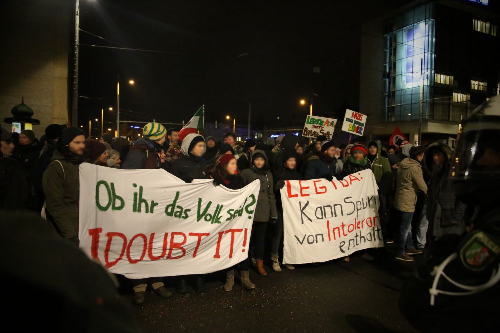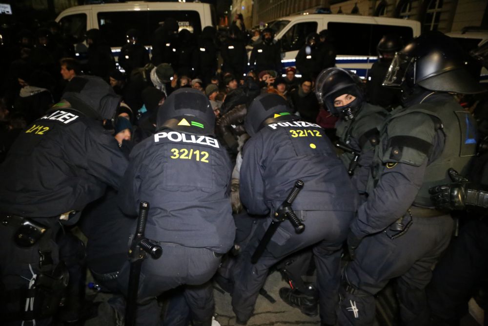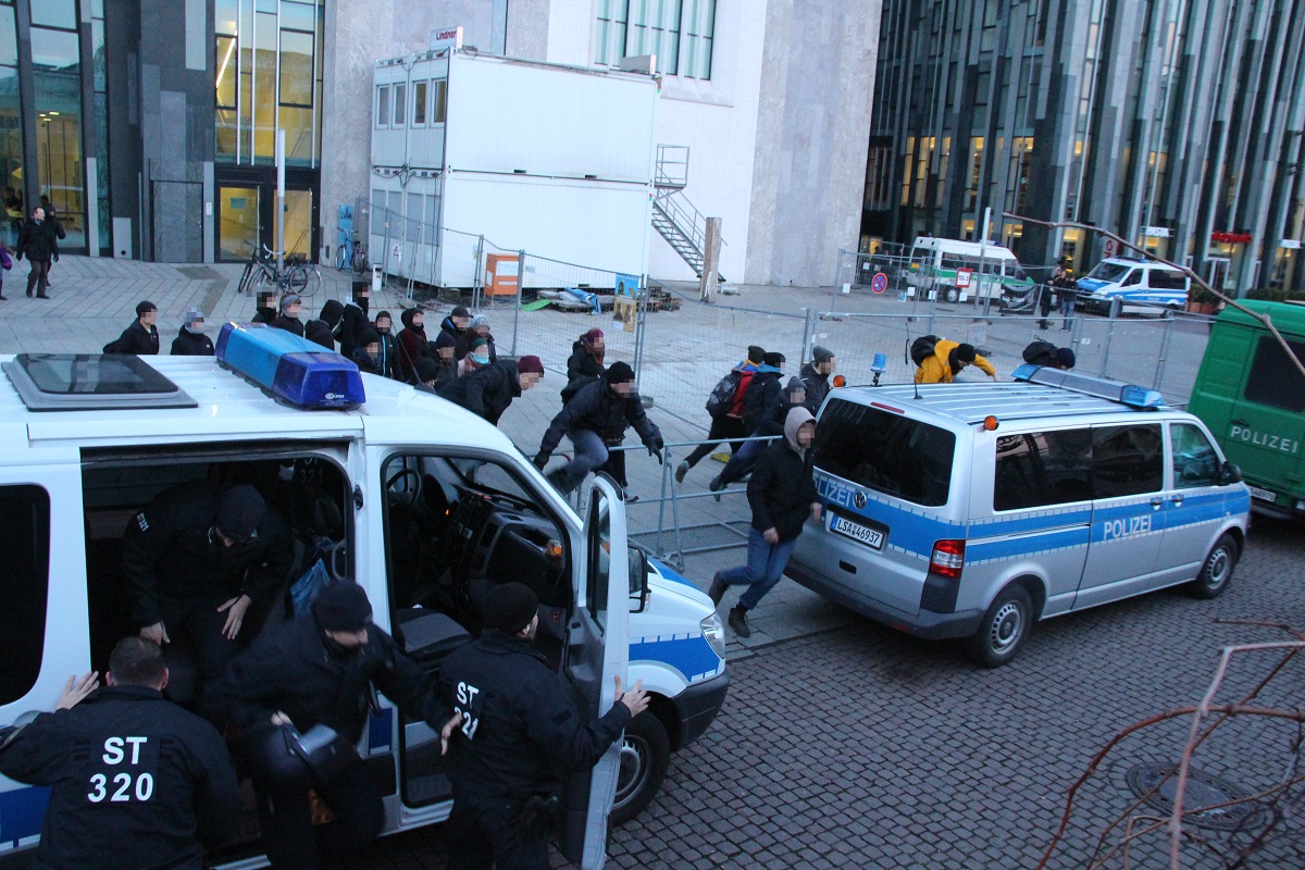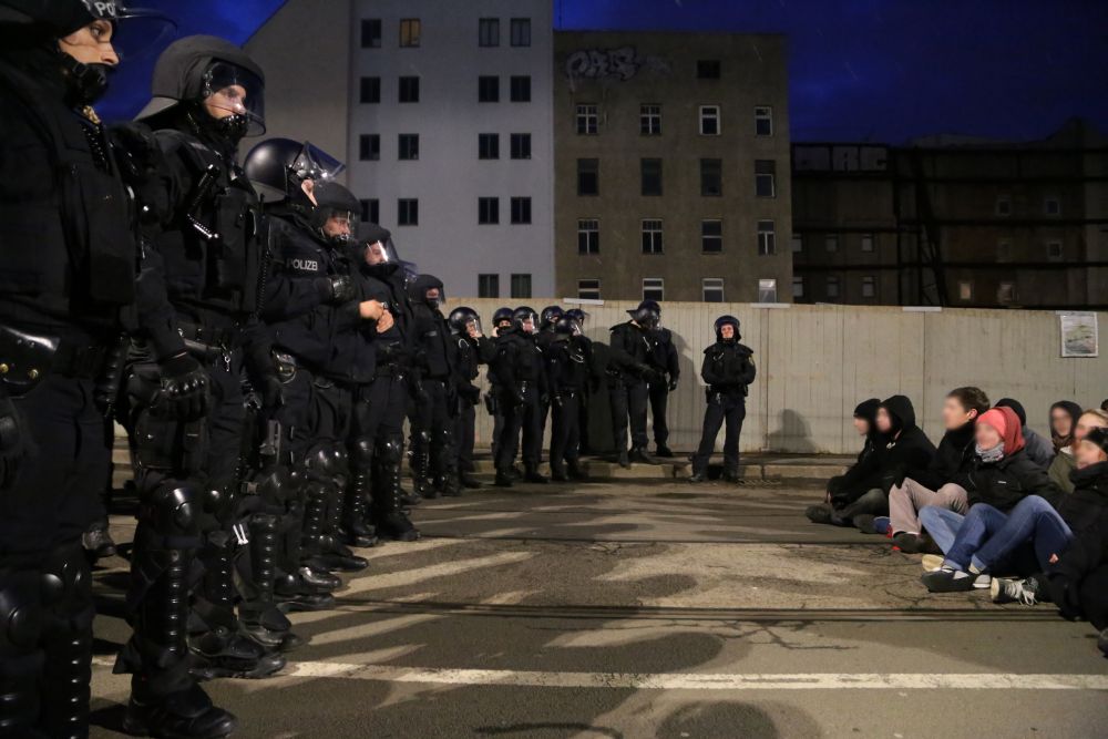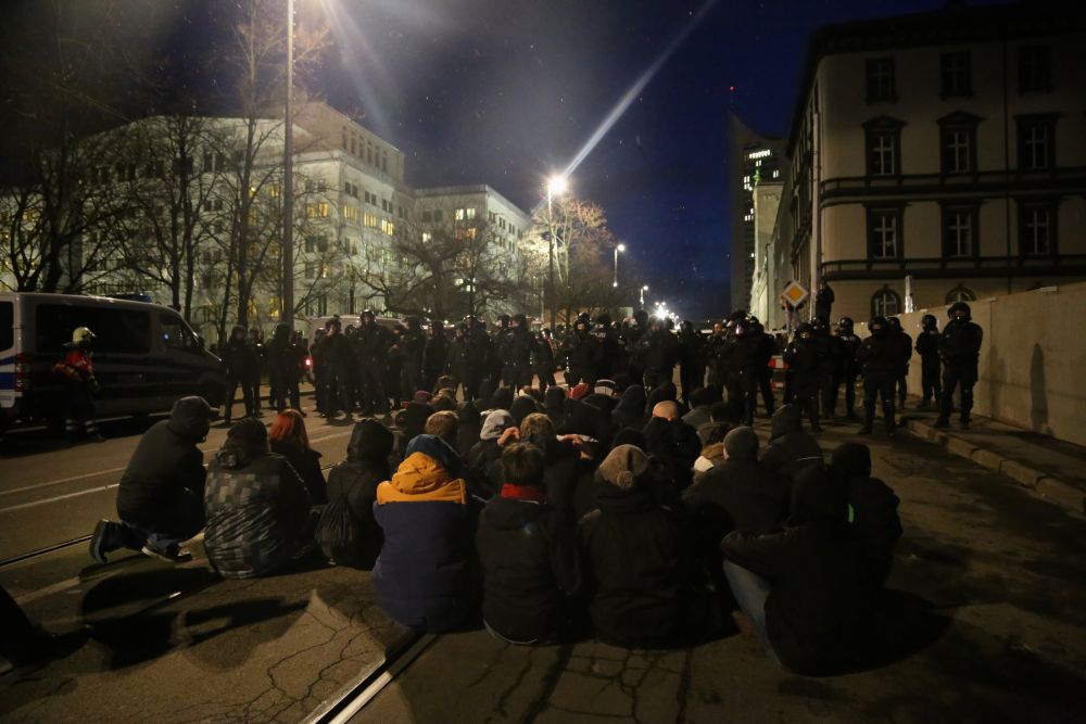 Als Aktivisten gegen 17 Uhr aus einem Universitätsgebäude heraus versuchten, über Polizeiabsperrungen auf den Augustusplatz zu gelangen, wirkten die Einsatzkräfte zunächst noch überfordert. Sie reagierten mit Pfefferspray und Schlagstöcken, einige Personen wurden festgenommen. Als dann zu späterer Stunde jedoch von mehreren hundert Menschen die Zufahrt zum Augustusplatz in der Goethestraße blockiert war, gingen sie schon deutlich organisierter vor. Systematisch drängte man die friedlichen, singenden und von einer Sambagruppe begleiteten Demonstranten ab, darunter auch einige ältere Menschen. Die Polizei erklärt, die Lage sei auf Seiten der Gegendemonstranten „sehr angespannt und aggressiv“ gewesen. Vereinzelt flogen Farbbeutel auf Polizeiwägen.
