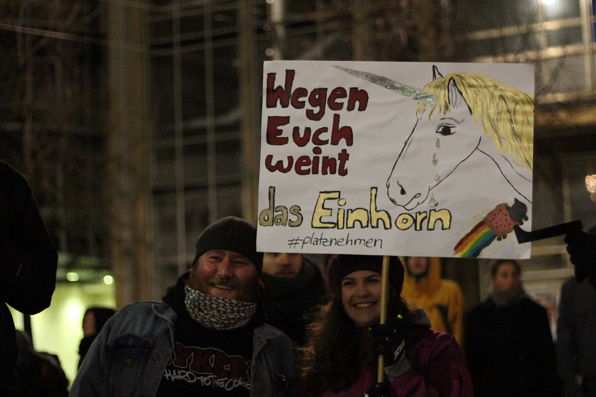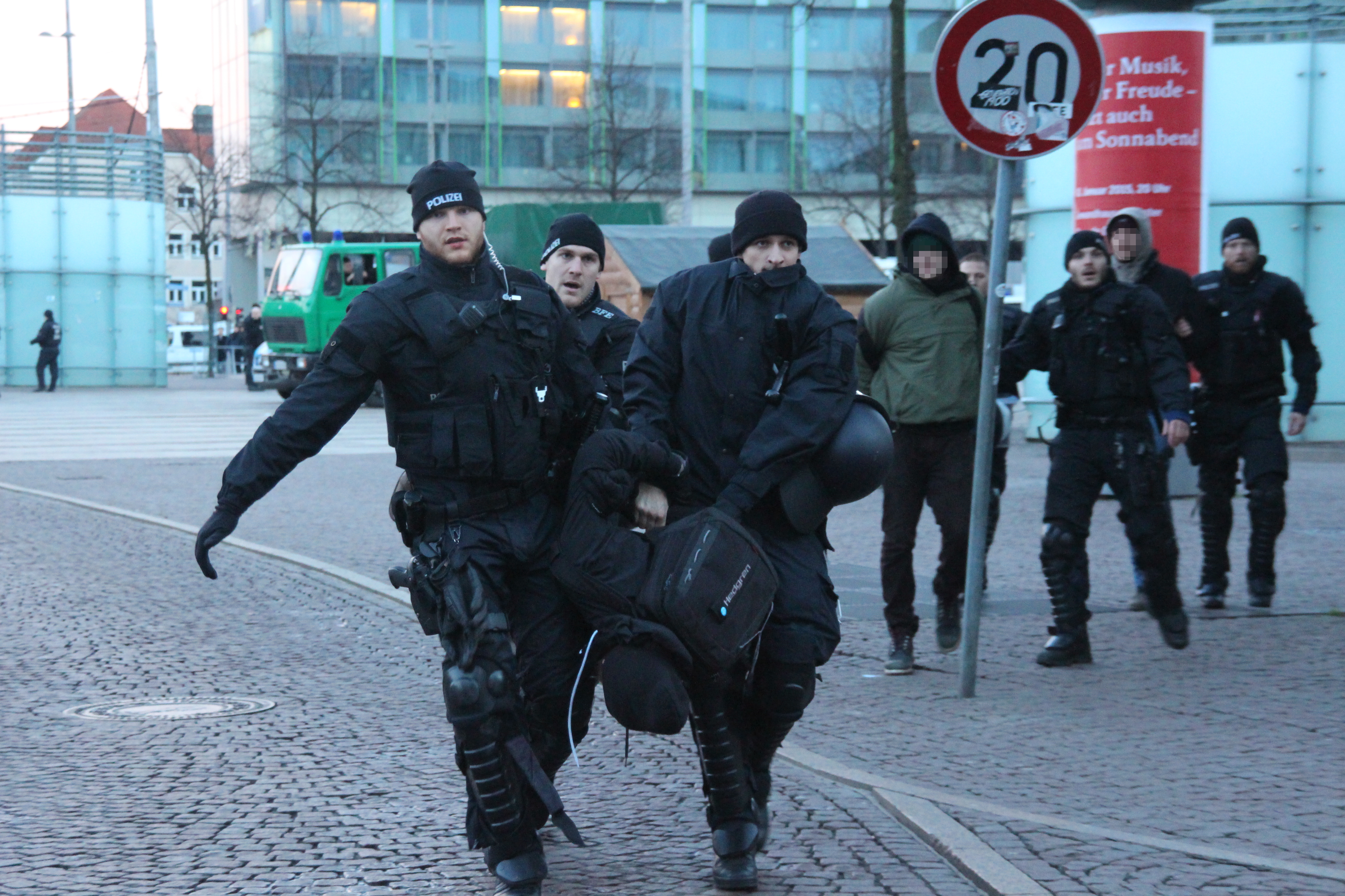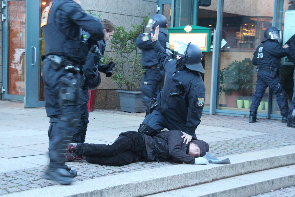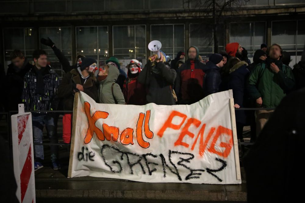 Als Aktivisten gegen 17 Uhr aus einem Universitätsgebäude heraus versuchten, über Polizeiabsperrungen auf den Augustusplatz zu gelangen, wirkten die Einsatzkräfte zunächst noch überfordert. Sie reagierten mit Pfefferspray und Schlagstöcken, einige Personen wurden festgenommen. Als dann zu späterer Stunde jedoch von mehreren hundert Menschen die Zufahrt zum Augustusplatz in der Goethestraße blockiert war, gingen sie schon deutlich organisierter vor. Systematisch drängte man die friedlichen, singenden und von einer Sambagruppe begleiteten Demonstranten ab, darunter auch einige ältere Menschen. Die Polizei erklärt, die Lage sei auf Seiten der Gegendemonstranten „sehr angespannt und aggressiv“ gewesen. Vereinzelt flogen Farbbeutel auf Polizeiwägen.
