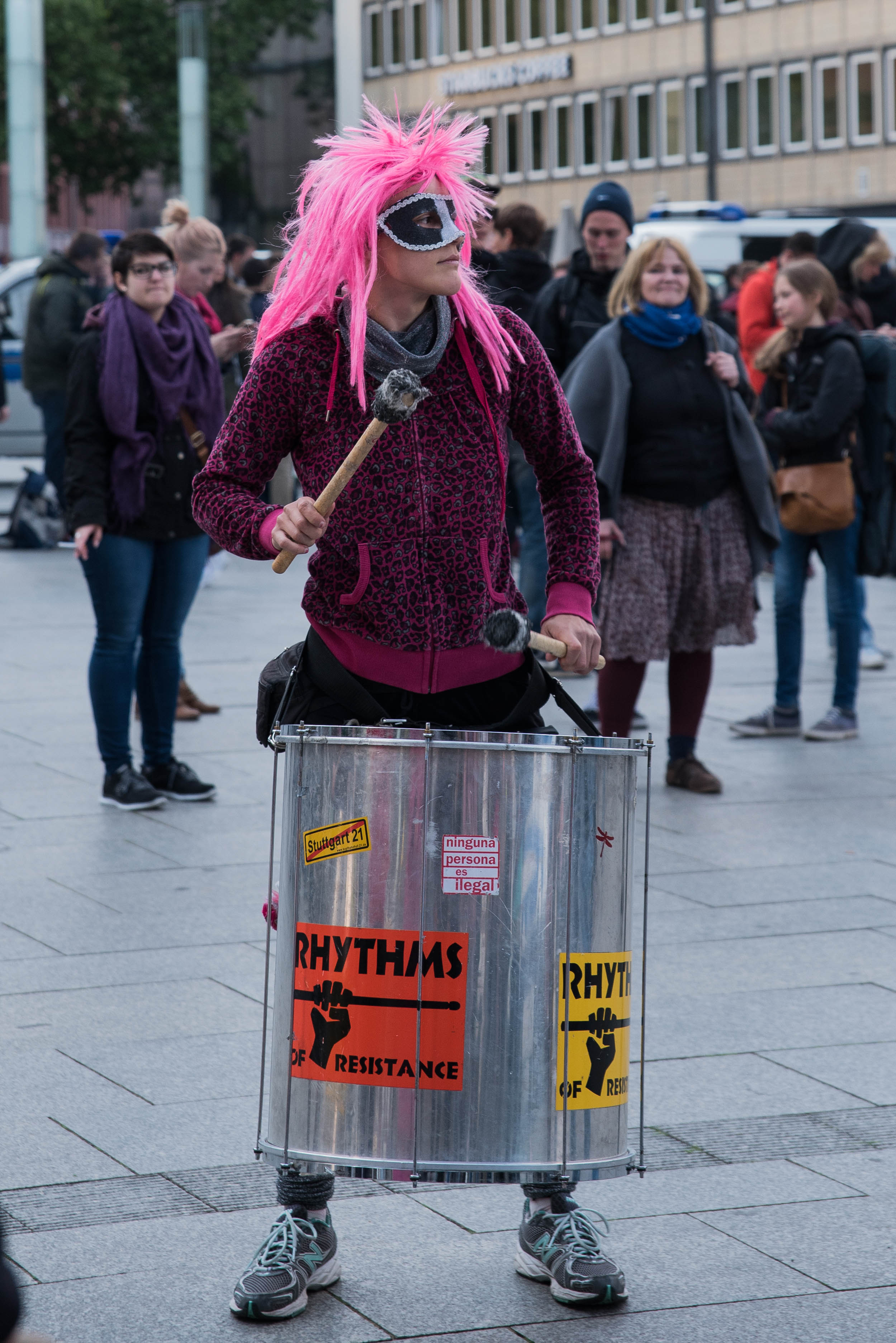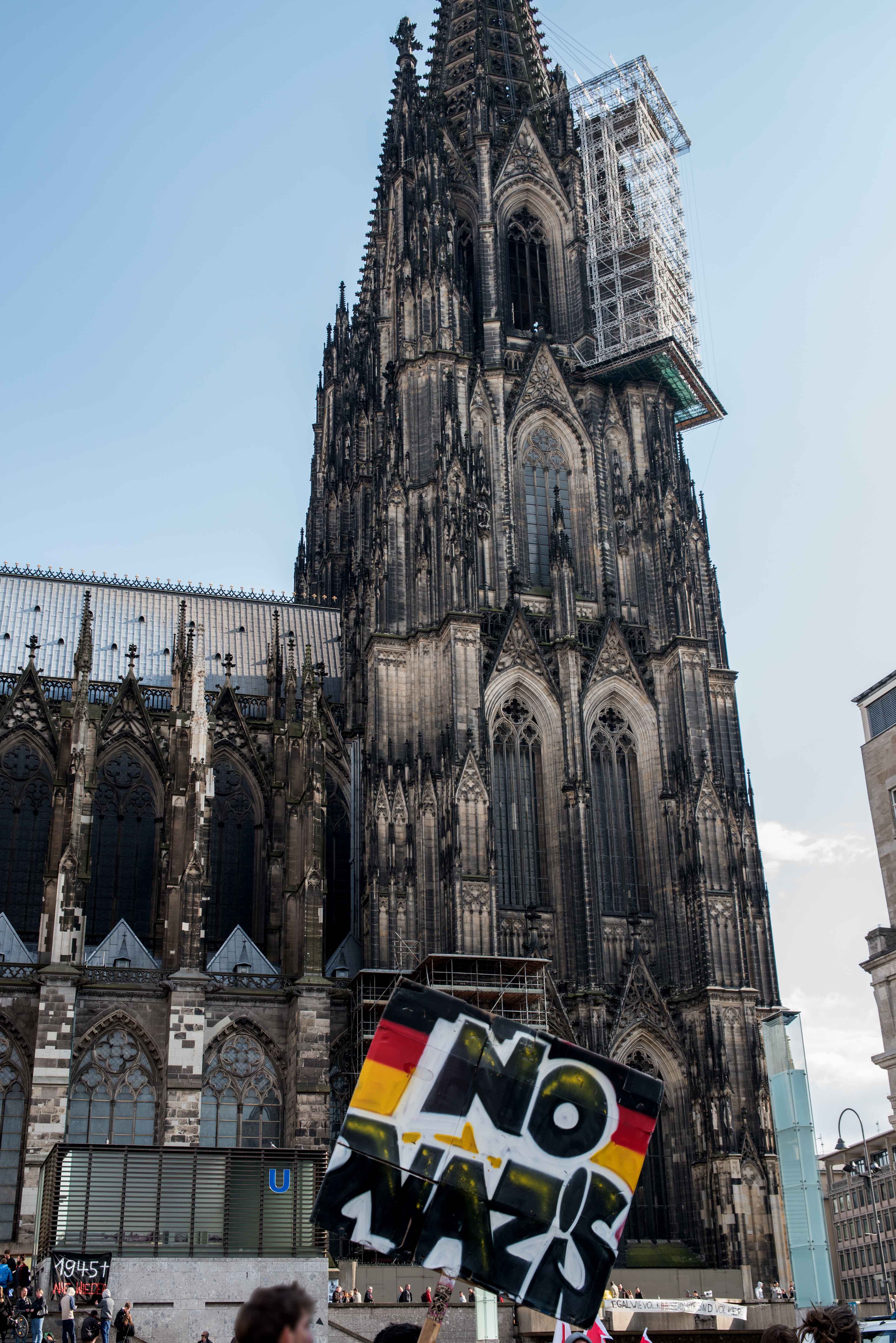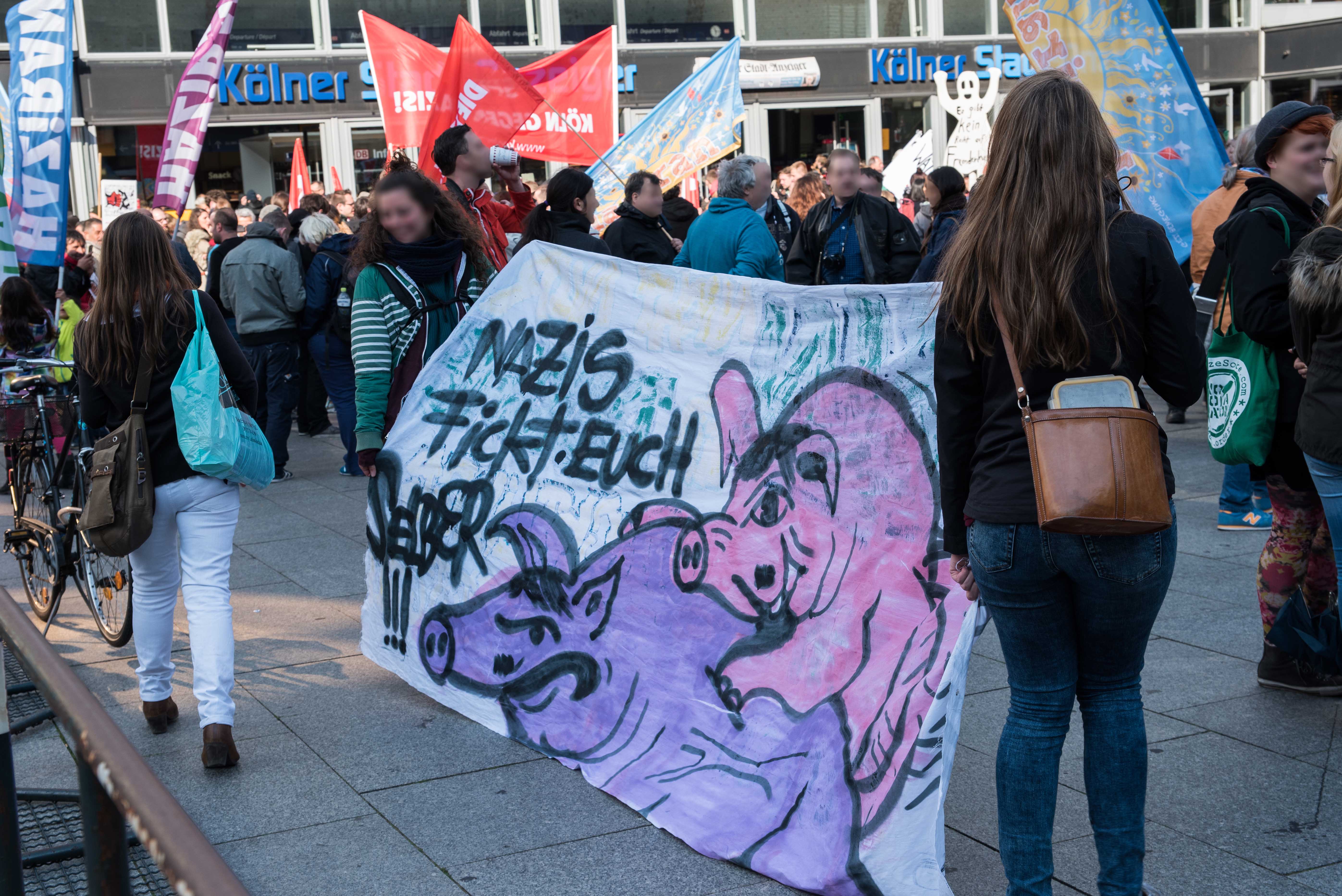 Bereits gegen 17 Uhr sammelten sich zahlreiche Gegendemonstranten auf der Domplatte, um mit Musik, Sprechchören, Trommeln und Transparenten gegen die Islamfeinde zu protestieren. An den Protesten beteiligte sich eine bunte Mischung aus Antifa-Gruppen, Parteien, Bürgern und NGOs. Trotz zwischenzeitlichen Regens blieb die Stimmung auf der Domplatte durchgehend gut. Nachdem die Absage von Kögida mit lautem Jubel begrüßt wurde, formierte sich gegen 20 Uhr eine spontane Demonstration mit mehreren hundert Menschen, die dafür die angemeldeten Route von Kögida nutzen.