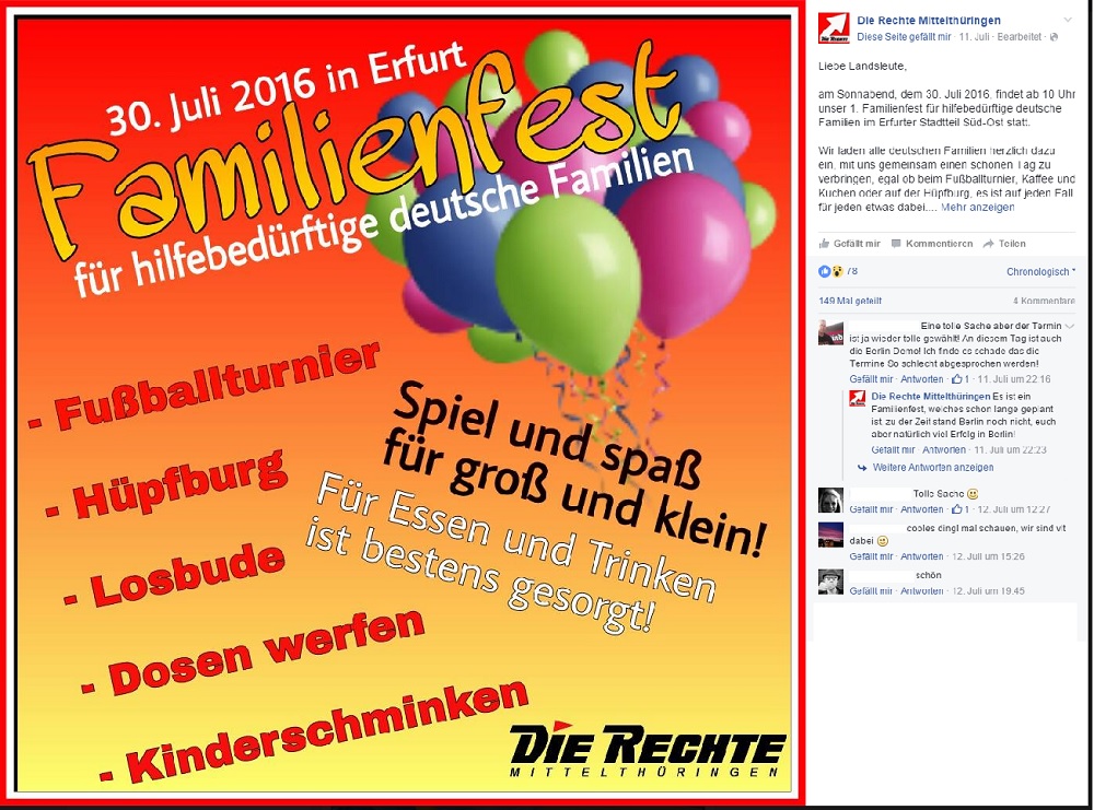 dem Erscheinen der Analyse stärkt auch die Gruppe „Antifaschistische Koordination Erfurt“ diese Einschätzung und warnt vor einem Rechtsrock-Konzert in der „Volksgemeinschaft“: „damit droht das Gebiet um die ehemalige Kaufhalle in der Stielerstraße eine No Go Area für nicht rechte Personen zu werden“. Die Hüpfburg der dort beheimateten „Volksgemeinschaft“ dürfte auch am Samstag, d. 30.07.2016 zu sehen sein, wenn der DR-Kreisverband Mittelthüringen ein Fest unter dem Motto „Deutsche Familien zuerst“ veranstalten will. Doch neben Hüpfburg und Lotterie ist intern die Rede von einer „politischen Standkundgebung“ mit „mehreren Redebeiträgen in regelmäßigen Abständen wie es sich für eine Kundgebung gehört“. Was genau Michel Fischer als Anmelder dazu beitragen will, „damit auch unsere Kinder ein kleines Leuchten in ihren Augen haben“, ist bislang nicht bekannt. Er war 2014 verurteilt worden, weil er einen 13-jährigen Jungen körperlich misshandelt hatte.