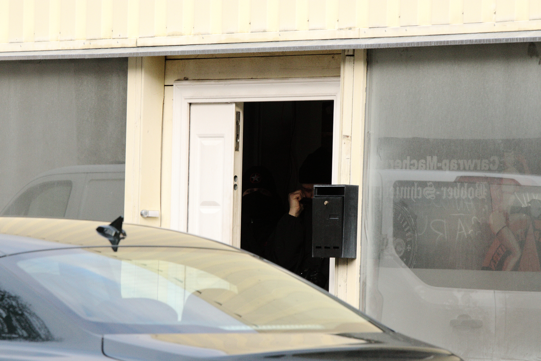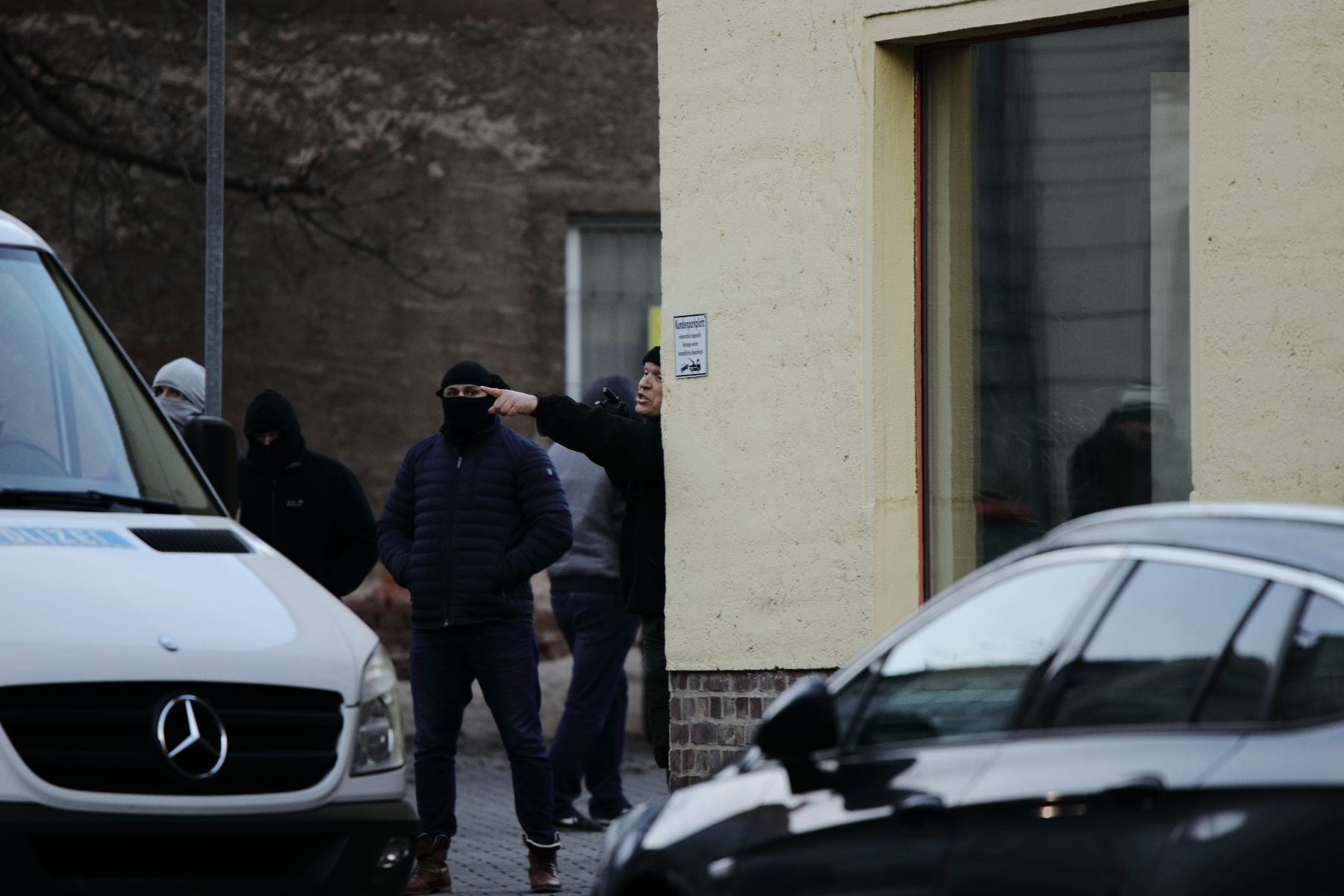 Von dem Angriff selbst erfuhr die Polizei nach eigenem Bekunden erst aus den sozialen Netzwerken. Als Polizisten eintrafen, versteckten die Neonazis ihre Waffen in der Werkstatt. Am Rande drängte ein Polizist Journalisten gewaltsam zur Seite. Als die sich ausweisen wollten, brüllte er sie an, sie sollten sich „verpissen“. Erst als Filmteams dazu kamen, ließ er von den Journalisten ab. Zehn Beamte sprachen mit den Neonazis, betraten kurz darauf deren Werkstatt. Waffen konnten sie keine finden. Die Staatsanwaltschaft habe trotz umfangreichen Waffenarsenals der Neonazis und dutzender Beweisfotos keinen Durchsuchungsbeschluss ausgestellt, bestätigt die Pressestelle der Polizei.