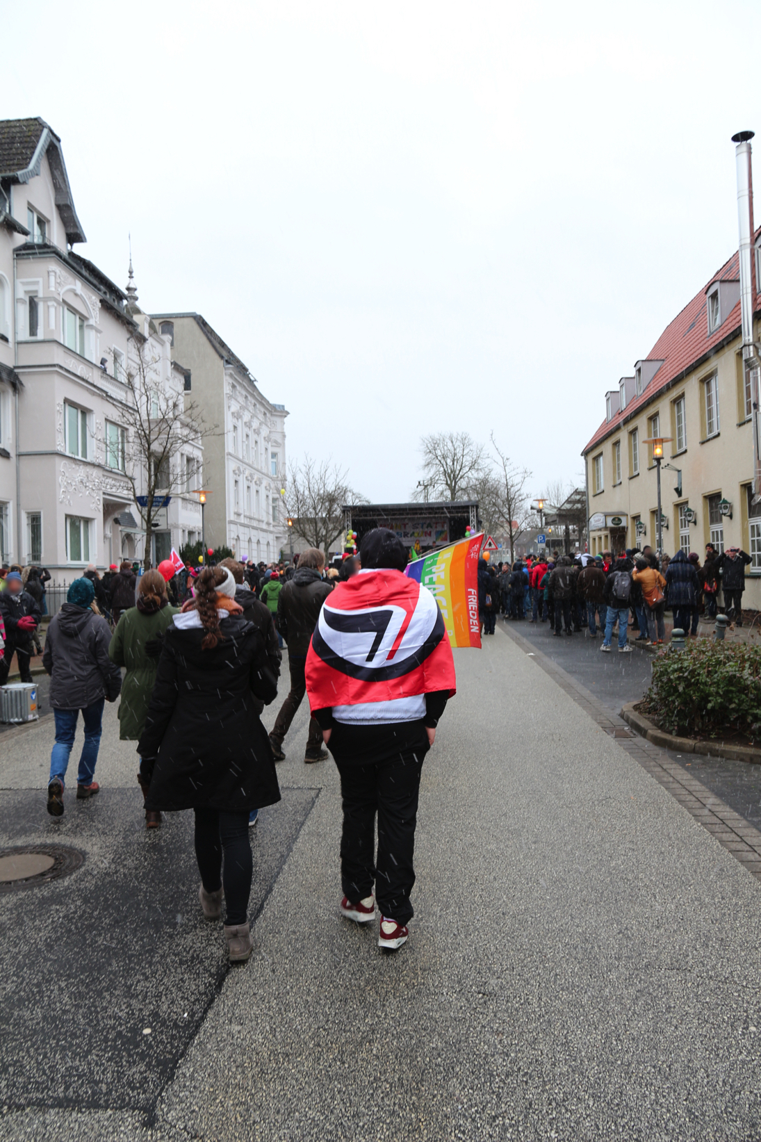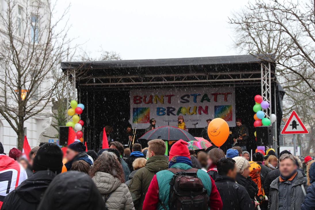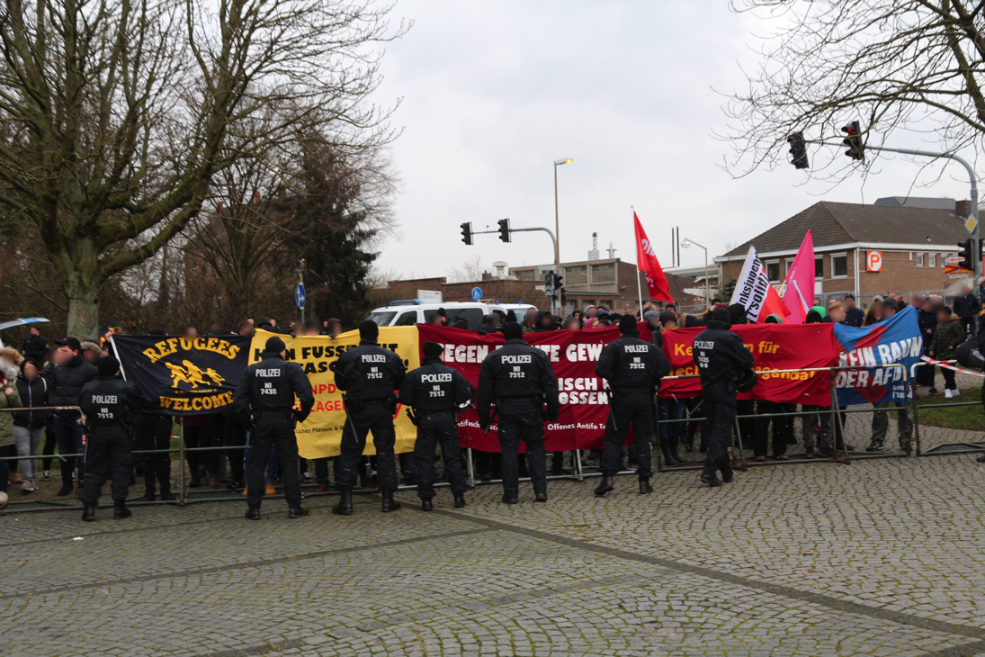 An den Gegenprotesten beteiligten sich rund 250 Menschen. Etwa 60 von ihnen zogen spontan von der Kundgebung des „Peiner Bündnis für Toleranz“ zu den Absperrungen am Schützenplatz, entrollten in Hör- und Sichtweite zu den extrem Rechten Transparente und riefen lautstark Parolen, wie „Nazis raus“.