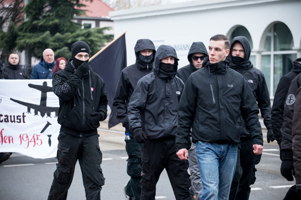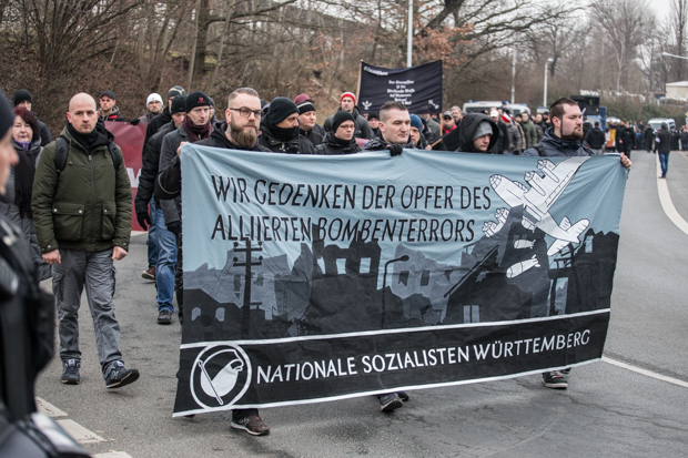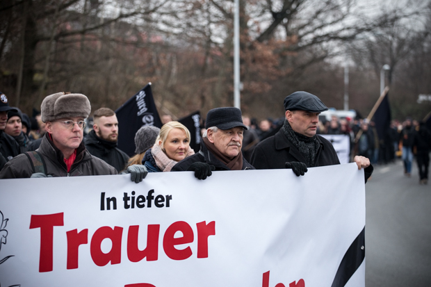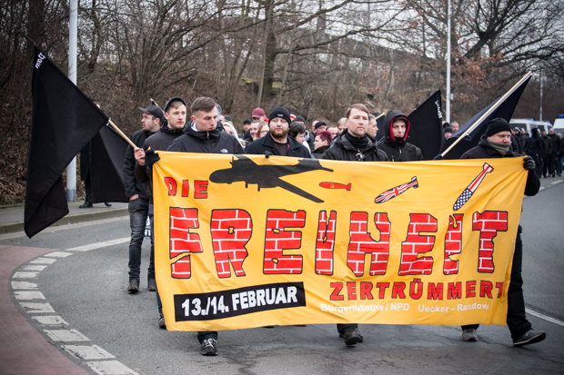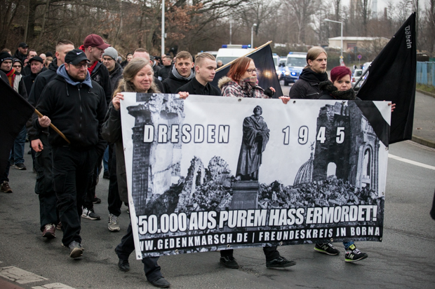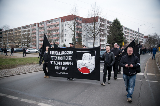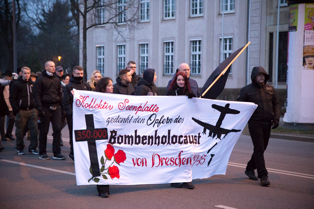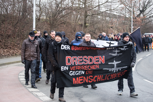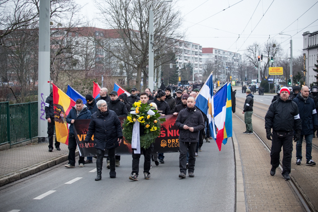 Der Neonazi-Aufmarsch sammelte sich am S-Bahnhof Reick, zog schweigend und von klassischer Musik begleitet zum großen Garten. An der Spitze wurden ein Kranz und verschiedene Banner getragen, auf denen die Bombenangriffe auf Dresden mit dem Holocaust gleichgesetzt wurden. Die antisemitische Ausrichtung wurde auch deutlich, als eine Teilnehmerin des Neonazi-Aufmarsches den Gegendemonstranten „Nie wieder Juden” zurief. Die Neonazis gingen auch mit den Opferzahlen des Bombardements großzügig um – offiziell starben 25.000 Menschen, auf der Demonstration wurden bis zu 350.000 Tote herbeiphantasiert.