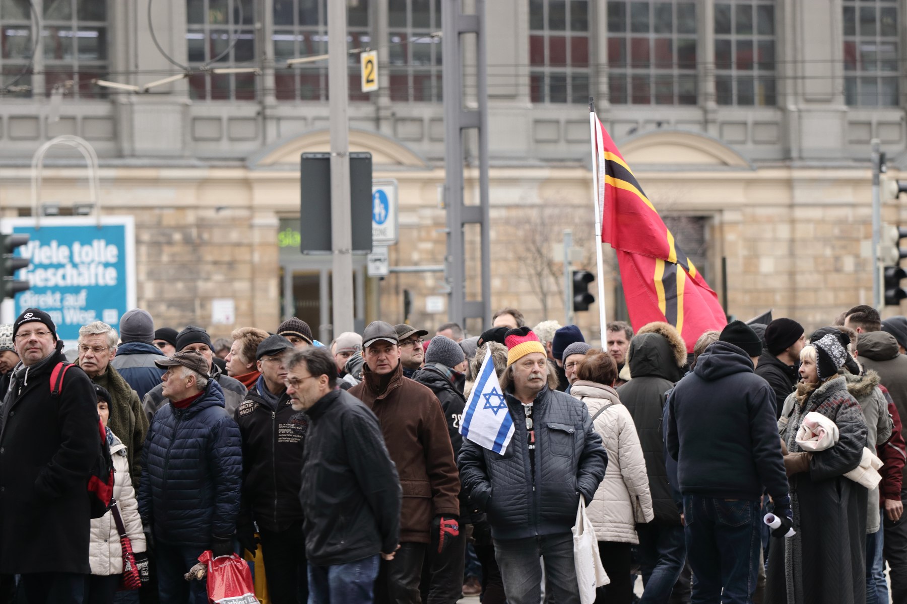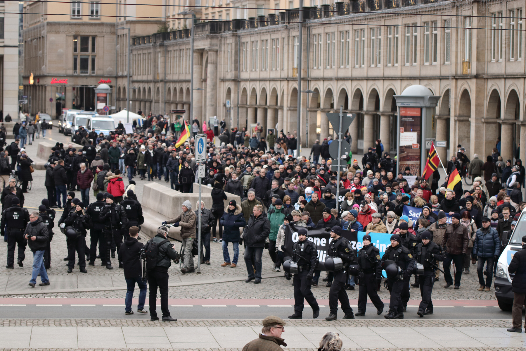 Parallel zum Neonazi-Aufmarsch fand in der Dresdner Altstadt eine Demonstration der „Jungen Alternative“ und der AfD statt, an der sich auch „Pegida“ beteiligte. Offiziell richtete sich die Veranstaltung gegen „offene Grenzen”, das Gedenken wolle man erst am 13. Februar begehen. Dennoch gab es etliche Bezüge zum Bombardement Dresdens.