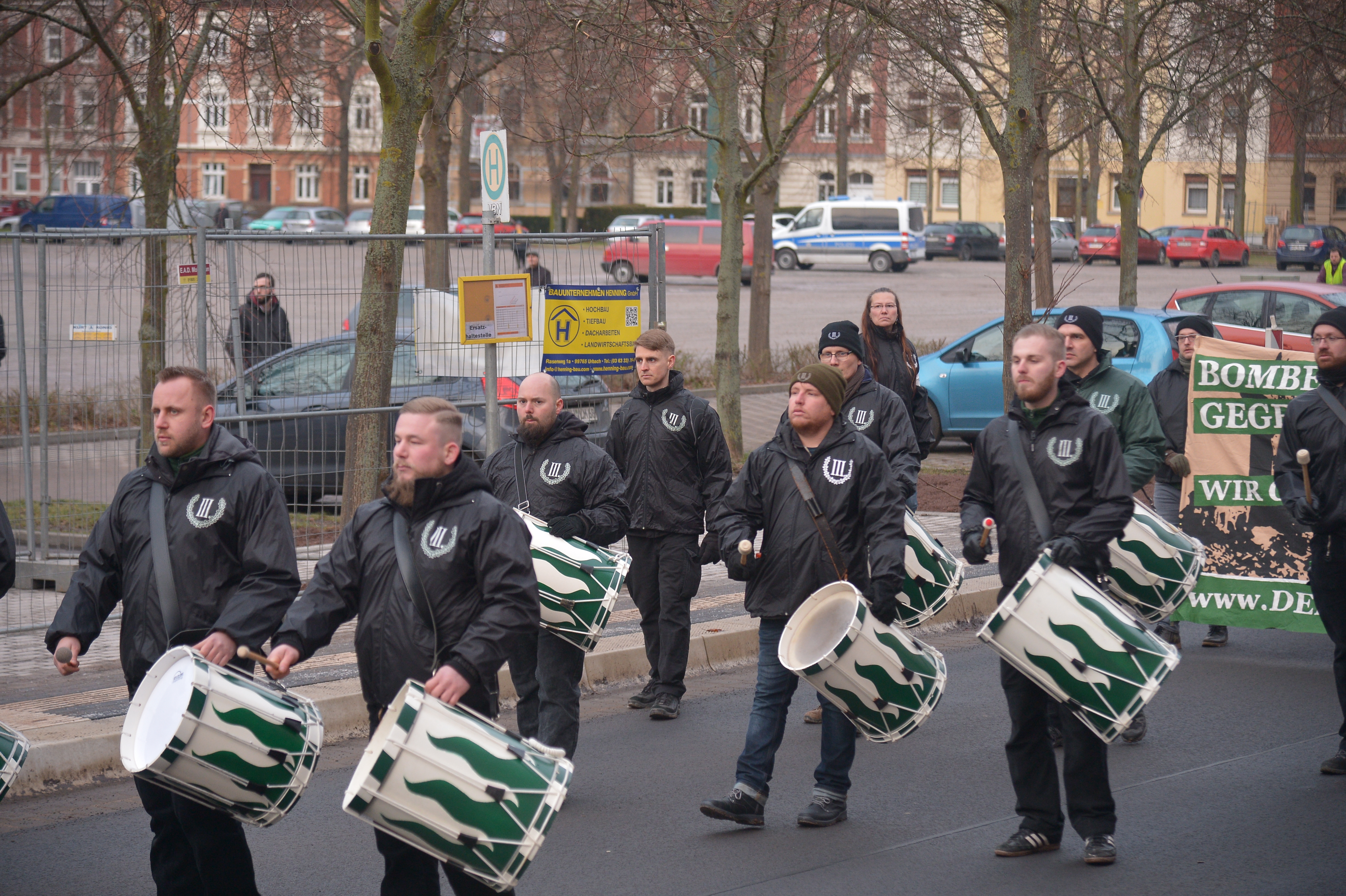 Vermummte mit schwarz-weiß-roten Mützen – den Farben des deutschen Kaiserreichs – stehen schon am frühen Nachmittag am Postplatz. Auch junge Frauen haben sich schwarze Tücher tief ins Gesicht gezogen. Die Teilnehmer tragen Kaiserreichs-Fahnen über der Schulter, fordern auf Plakaten die Freilassung verurteilter Rechtsextremer.