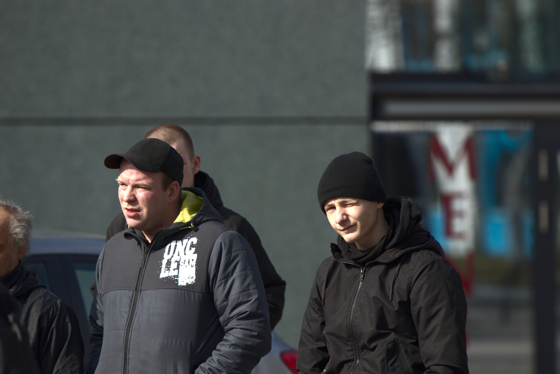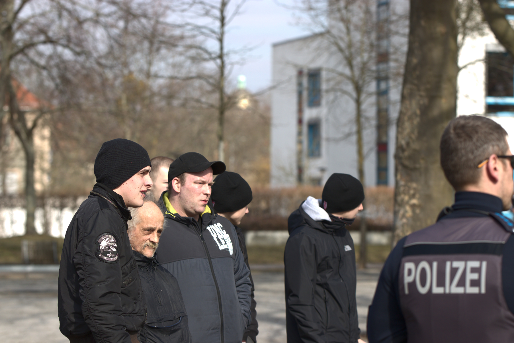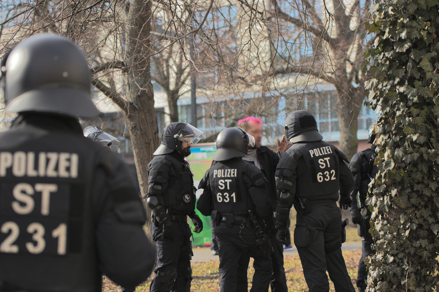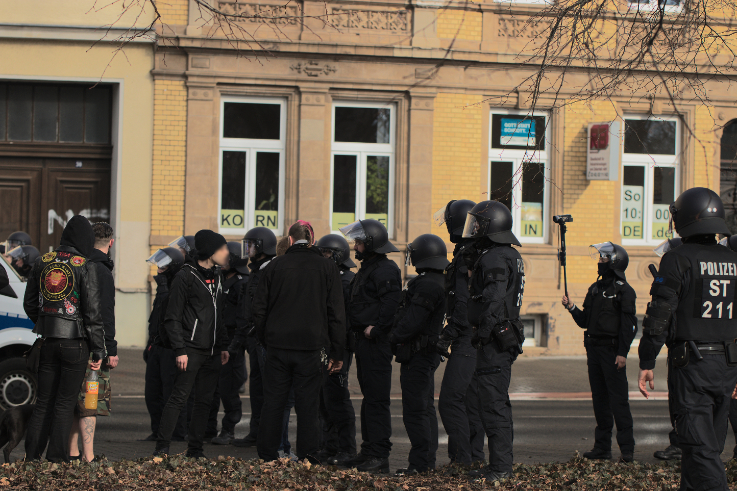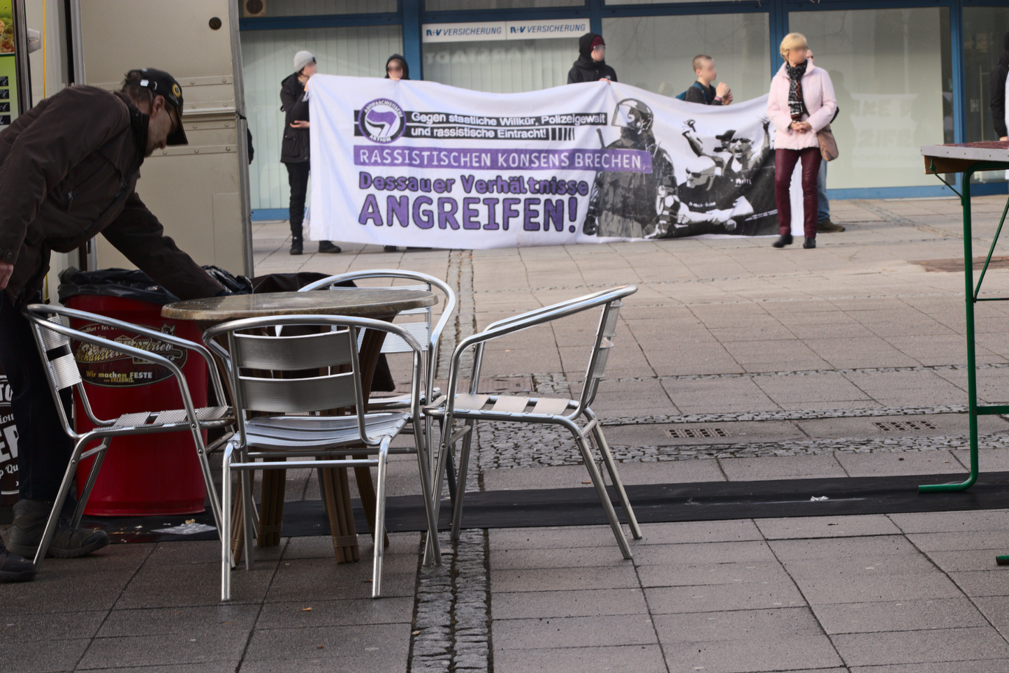 Die Demonstration startet nach dem Tumult mit einiger Verspätung. Auf dem Weg durch Dessau wartet eine kleine Gruppe Rechter, die Polizei aber bemerkt das früh und drängt sie einige Meter zurück. Viele Passanten filmen den Aufzug, der laut Polizei 80 Personen umfasst.