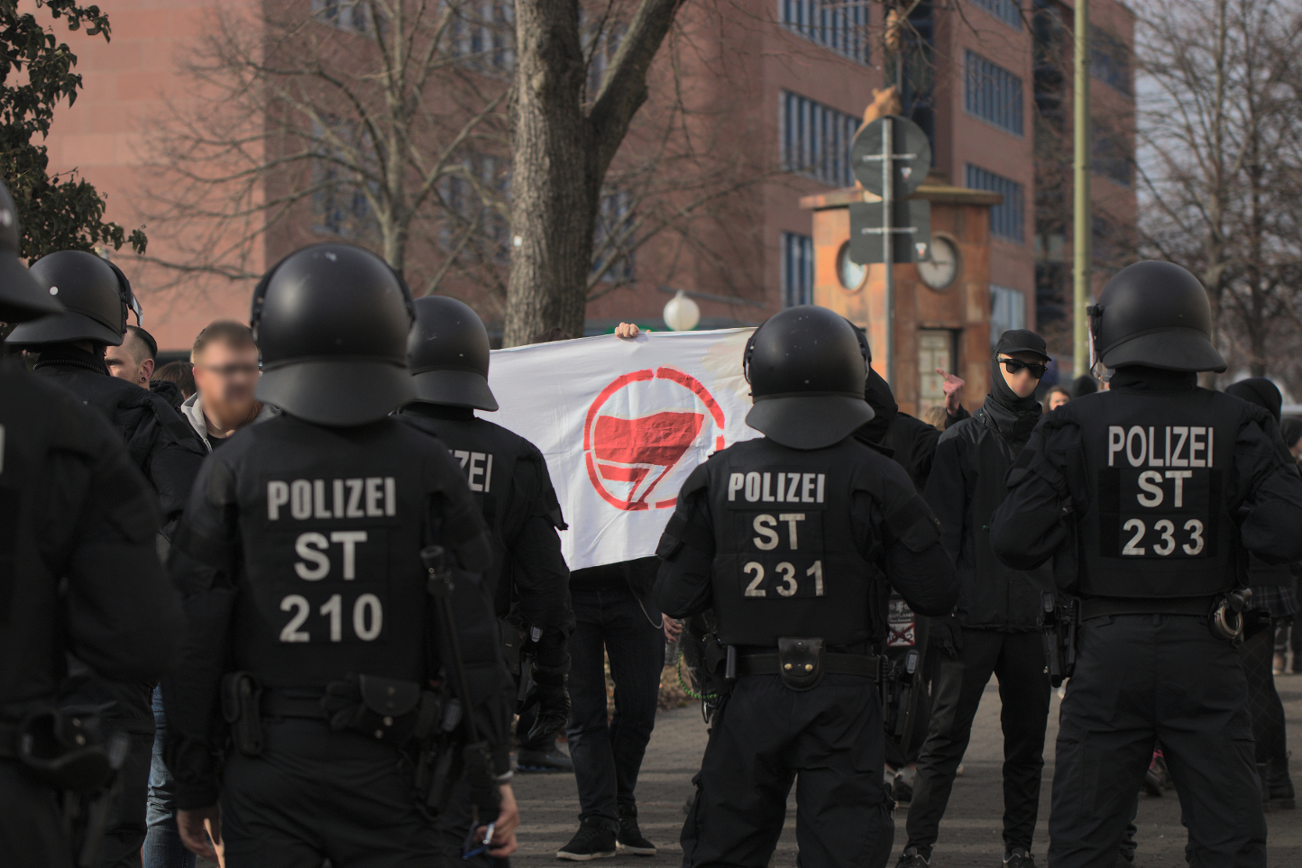 Wenig später kommt es bei der linken Demonstration auf der anderen Bahnhofsseite zum nächsten Tumult. Auch hier will eine Gruppe Neonazis provozieren, geht zielgerichtet auf die Linken zu, wird von der Polizei rechtzeitig abgedrängt. Teilnehmer der Demonstration aber lassen sich provozieren, rennen wiederum in Richtung der Neonazis. Wieder sind die Beamten in der Unterzahl, können die Gruppen kaum trennen. Gerangel, Geschrei, Wut – die Gruppen mischen sich. Die Polizei bekommt Verstärkung, setzt sich durch und bringt die Rechtsextremen in eine Seitengasse. Beim weiteren Geschubse zwischen ein paar Punks und der Polizei fliegt auch eine Flasche, die linken Demonstranten sind aufgebracht, lassen sich nur schwer beruhigen.