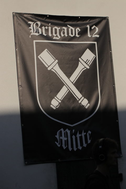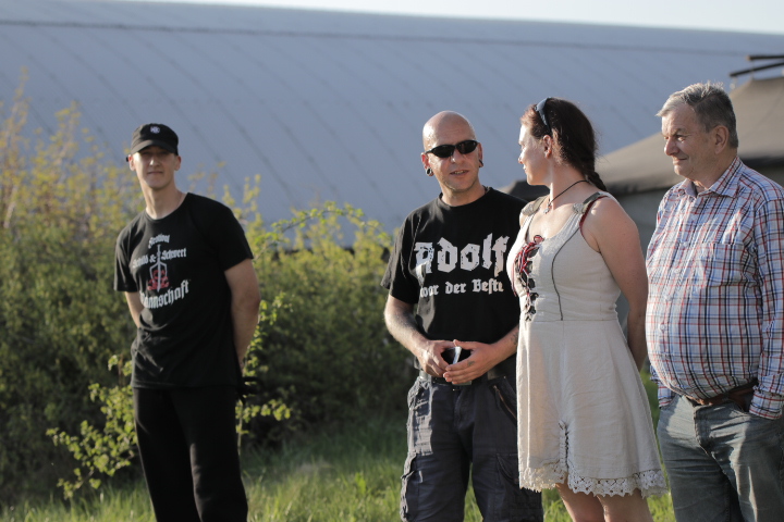 Schnell wird deutlich: Neugierige Gäste sind hier nicht willkommen. Das Areal wird von Skinheads bewacht, auf deren T-Shirts „Sicherheitsdienst Arische Bruderschaft“ steht. Ihr Logo sind zwei gekreuzte Wehrmachts-Handgranaten, ein riesiges Transparent hängt an ihrem Bauwagen.
