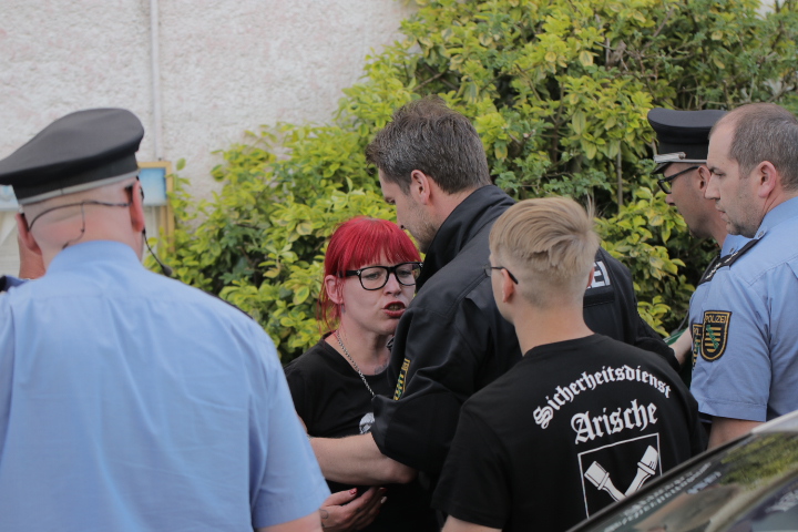 Auch sonst scheint die Polizei nicht mehr als eine Drohkulisse aufzubieten: Je später der Abend wird, desto mehr verschwinden Wasserwerfer, Räumpanzer und Pferdestaffel aus dem Sichtfeld. Das Grölen der Besucher ist fast im ganzen Ort zu hören – außer dort, wo demokratische Bürger ein Fest für Toleranz feiern. Kleingruppen aus Neonazis sind unterwegs, die Situation erscheint nicht ungefährlich.