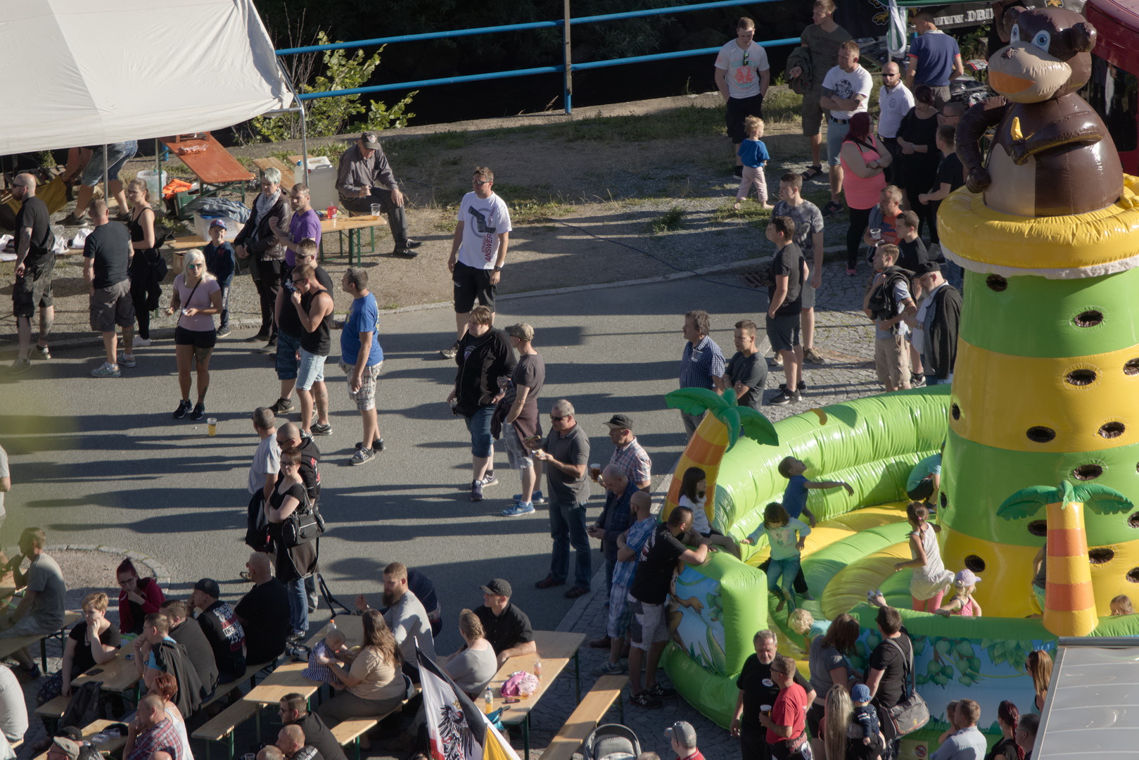 Über der sächsischen Stadt thront eine weiße Burg, Hochzeitspaare lassen sich vor der malerischen Bergkulisse fotografieren. Auf dem Parkplatz am Fuß der Burg bauen an diesem Wochenende bullige Männer eine Bühne auf, gegenüber grillen tätowierte Frauen mit rosa-schwarz gefärbten Haaren Bratwürste. Auf vielen T-Shirts steht „Deitsch un frei wolln mer sei!“, auf einem der Schriftzug „White Power“. 250 ganz ähnliche Gäste tummeln sich zwischen Bierbänken. Kinder toben auf einer grünen Hüpfburg, während es auf der Bühne plötzlich laut wird. Was hier geschieht, ist der Beweis, dass es im Jahr 2018 in Schwarzenberg nicht besser geworden ist. Eher schlimmer.