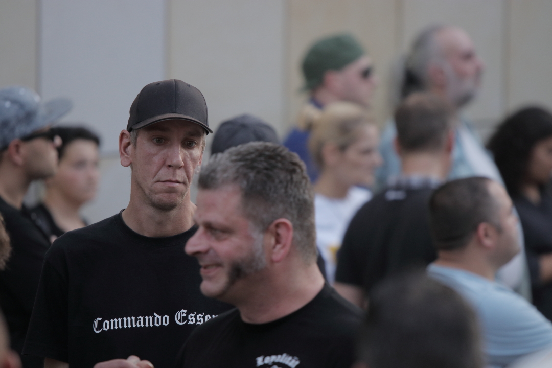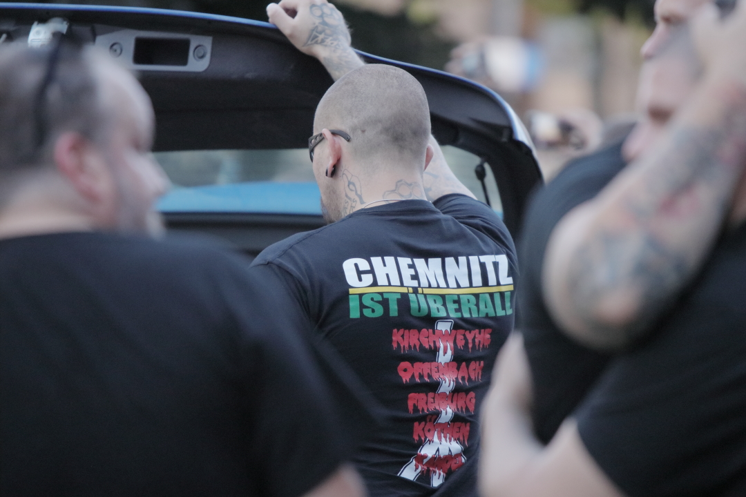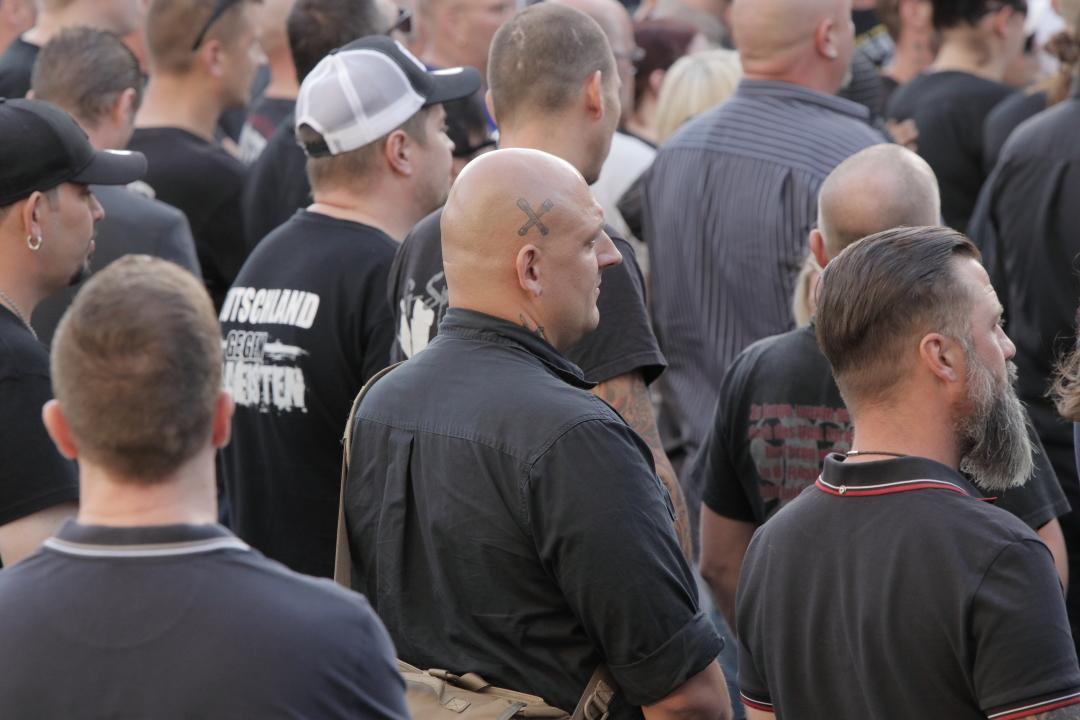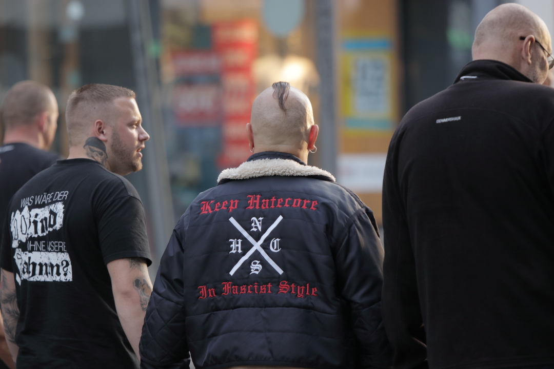 Das neonazistische Terrornetzwerk Combat 18 war neben Symbolen der griechischen faschistischen Partei Goldene Morgenröte präsent. Aus Thüringen hatte David Köckert zur Teilnahme aufgerufen – der markant tätowierte Rechtsextremist ist Organisator des völkischen Bündnisses Thügida. Neben ihm kamen vor allem lokale Szenegrößen wie der Dortmunder Neonazi-Haudegen Siegfried Borchardt, die sich im Hintergrund hielten.