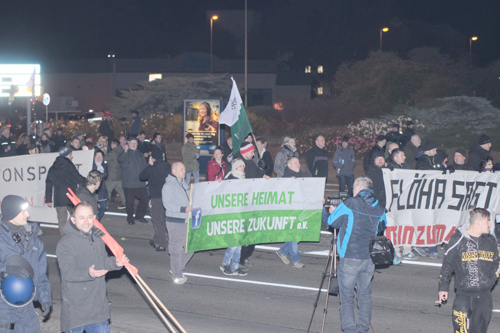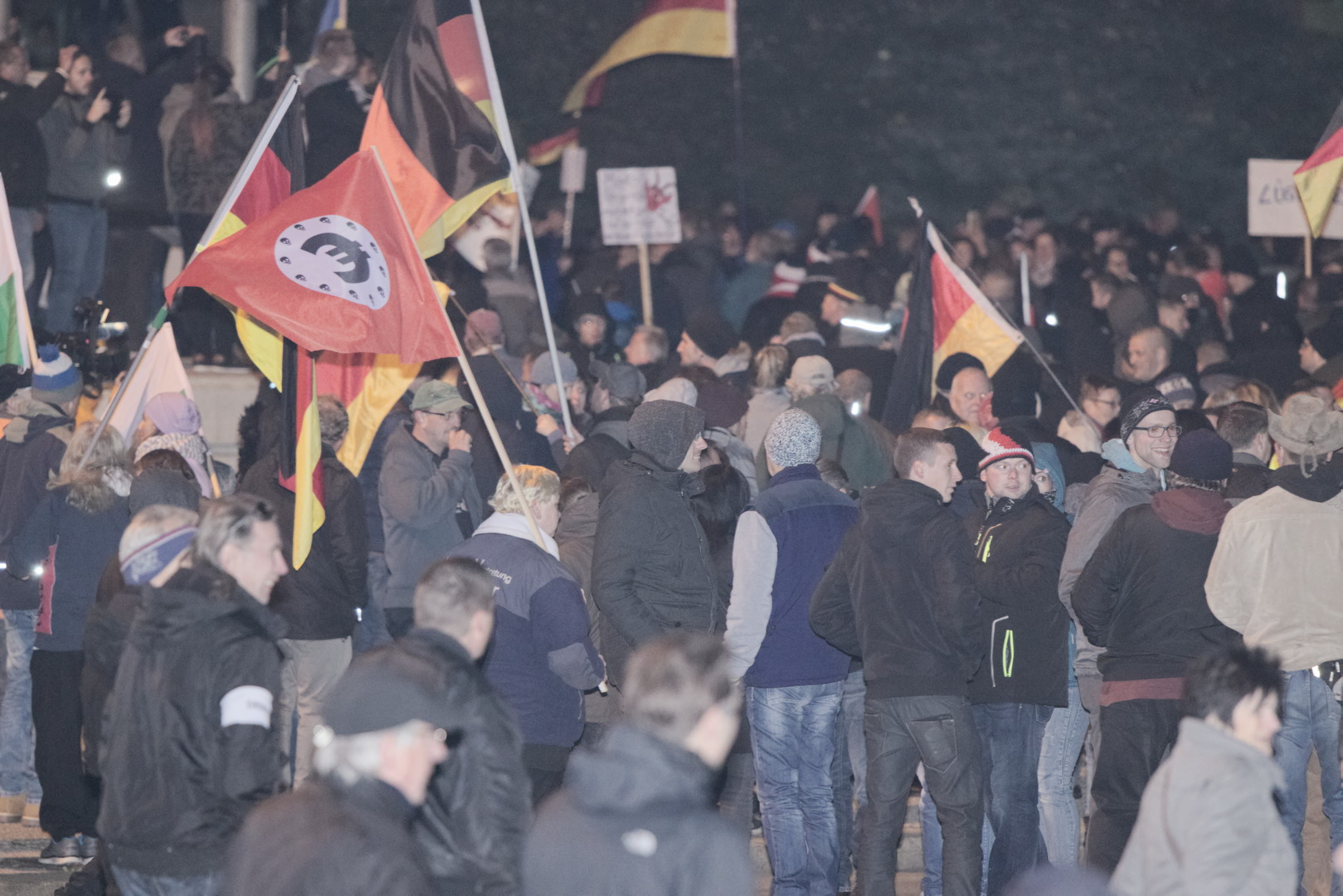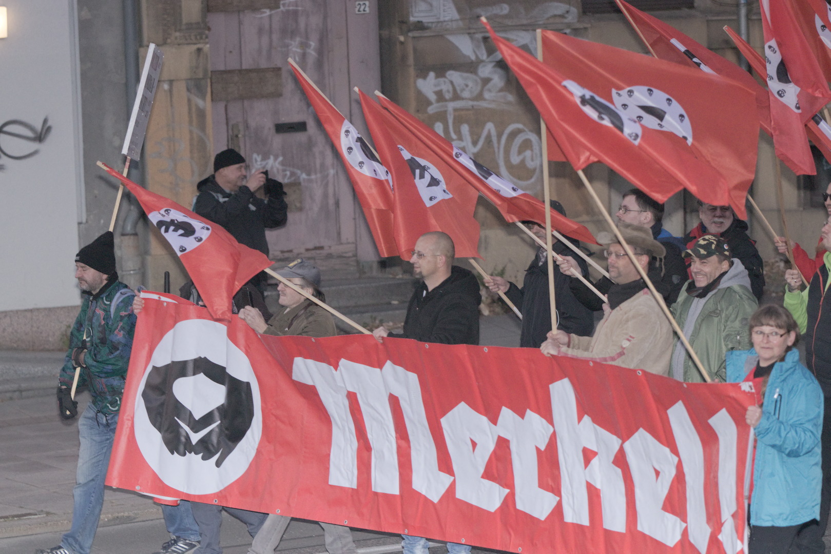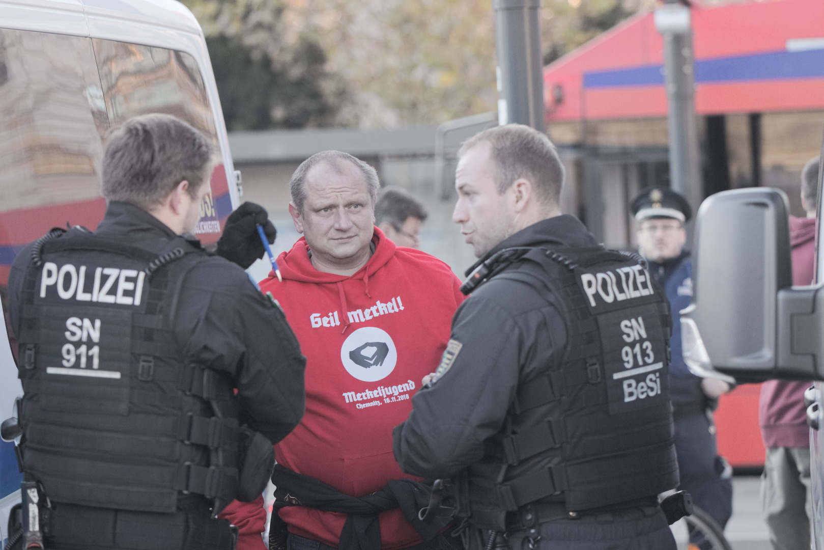 Knapp hundert, größtenteils zugereiste Verschwörungstheoretiker, Reichsbürger und Neonazis hatten sich für 15 Uhr am Hauptbahnhof verabredet: Mit schwarz-weiß-roten Fahnen marschierten sie quer durch die Stadt bis vor die Sporthalle der Niners, um sich dort mit Teilnehmern einer Kundgebung von Pro Chemnitz zu vereinen. Die Demonstranten nennen sich, in Anspielung auf die Hitlerjugend, Merkeljugend. Methode der Gruppe ist es, Angela Merkel über die Ästhetik des NS-Regimes mit Adolf Hitler gleichzusetzen. Dass es dabei nicht um Satire und Spaß geht, zeigen die Rechtsextremen spätestens dann, als sie Reporter bedrängen und Polizisten bepöbeln.