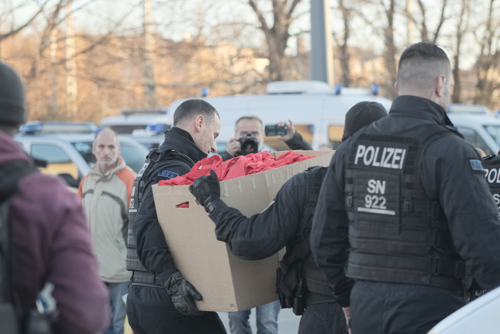 Zu sehen sind schwarz-weiß-rote Fahnen, auf die das Euro-Zeichen und Totenköpfe gedruckt sind. Die Polizei beschlagnahmte eine Kiste mit T-Shirts, die der Veranstalter ursprünglich an die Teilnehmer verteilen wollte. Darauf war das Markenzeichen der Kanzlerin, eine Raute, und der Slogan „Geil Merkel“ gedruckt. Die Polizei prüft nun, ob der Straftatbestand der Beleidigung erfüllt ist. Ein Teilnehmer reckte ein Transparent mit der Aufschrift „Heil Merkel“ in die Höhe. Auch hier schritt die Polizei ein, das Transparent durfte nur noch eingeschränkt gezeigt werden, das Wort „Heil“ durfte nicht zu sehen sein. Auf einer Armbinde, die an nationalsozialistische Hakenkreuz-Binden erinnerte, trug der Anmelder der Veranstaltung – einst im neonazistischen und seit 2000 verbotenem Netzwerk „Blood and Honour“ aktiv – die Worte Sicherheits-Abteilung. Auch das untersagte die Polizei.