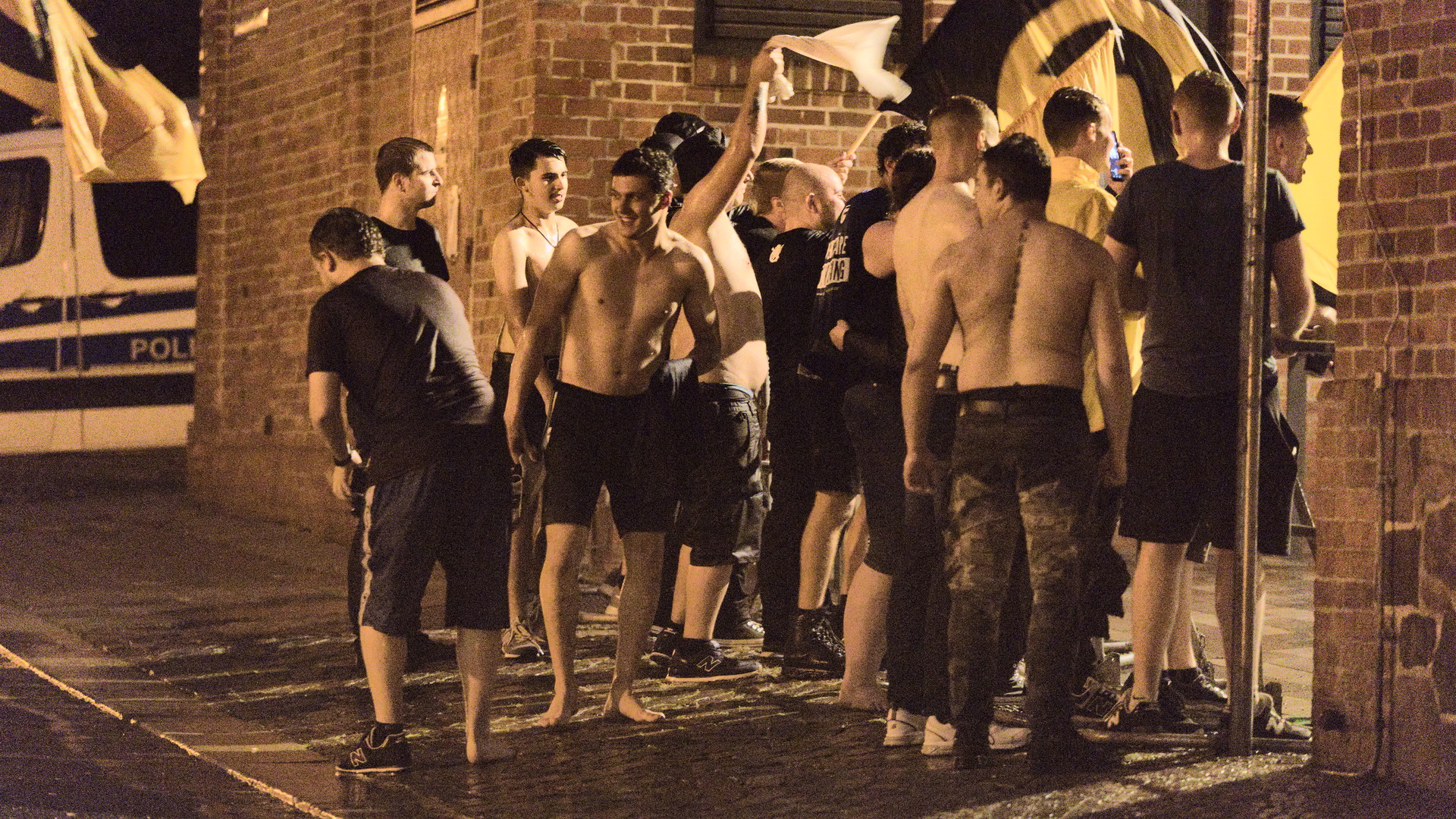 Der unfreiwillige Aufenthalt geriet zum PR-Desaster. Zwanzig Neonazis waren gekommen, um Sellner zu sehen. Und auch die berüchtigten Aryans hatten eine Delegation geschickt. Anhänger der Gruppe hatten am Rande einer Demonstration zum 1. Mai 2017 auf vermeintliche Gegner eingeschlagen, mit Steinen und mit Sprengkörpern geworfen. Anfang des Jahres wurden zwei Täter verurteilt, die Bundesanwaltschaft führt Terrorermittlungen gegen die Neonazis.