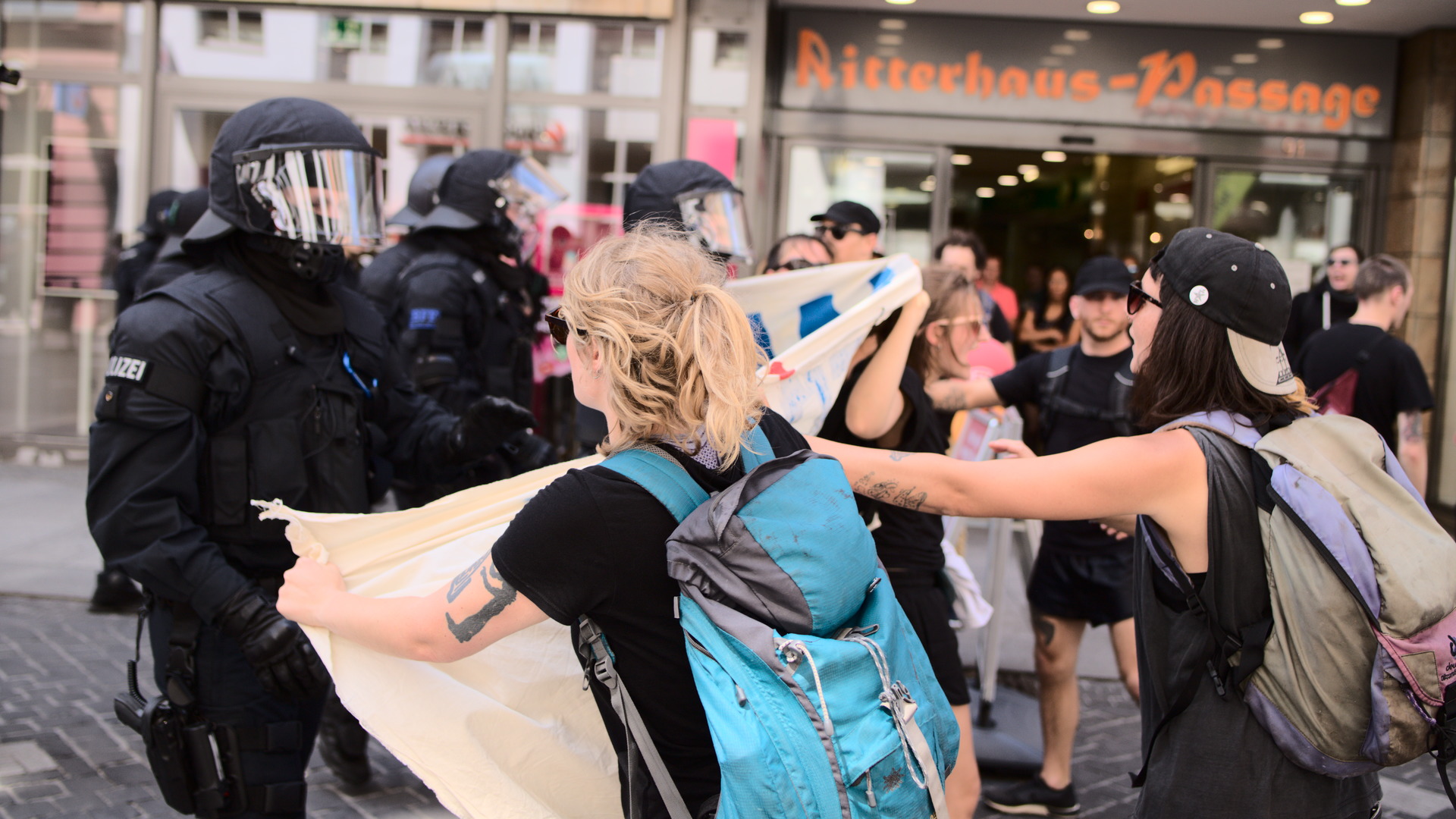 Auf die Vorzeichen folgten vor allem Fehler der Veranstalter. Der erste war, die Demonstration vom Haus der Identitären aus zu organisieren – denn antifaschistische Gruppen in Halle sind blockadeerfahren, gut organisiert und die schmalen Gassen der Stadt sind schnell dicht. Gegendemonstranten strömten in die Straßen um das Haus, sie setzten sich, nach kurzer Zeit gab es kein Durchkommen mehr. Noch vor Mittag waren die Demonstrationspläne begraben.