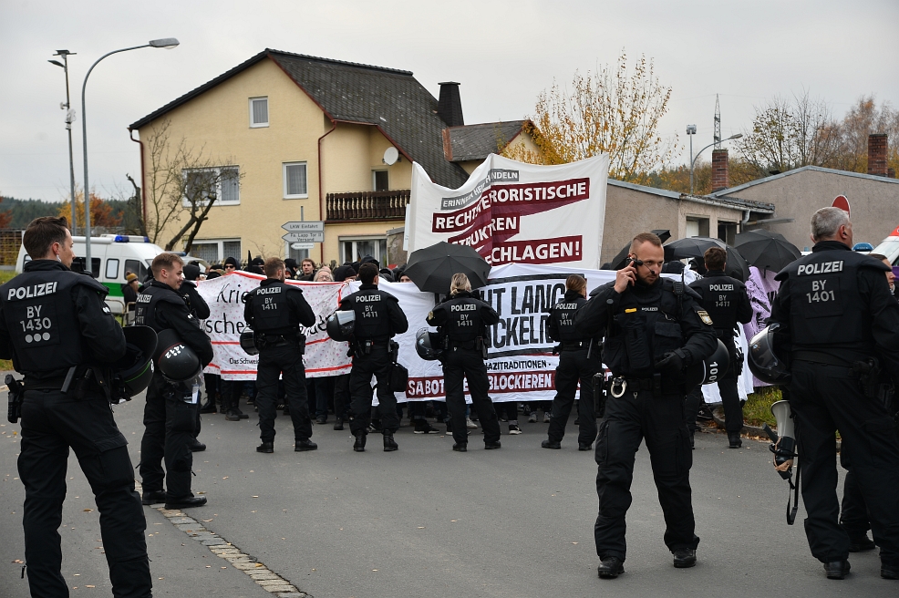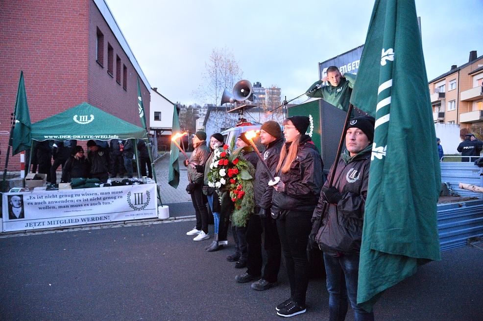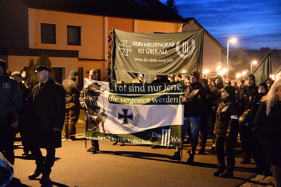 Am Samstag, einen Tag vor dem Volkstrauertag am 17. November, war es die Neonazipartei Der III. Weg, die ihre Anhängerinnen und Anhänger durch Wunsiedel laufen ließ. Von einem Wohngebiet aus zog ein Fackelmarsch mit rund 200 Teilnehmenden durch die Stadt. Sie nannten ihren Aufmarsch „Heldengedenken“. Unter demselben Credo trafen sich Rechtsextreme im thüringischen Schleusingen, knapp zwei Autostunden entfernt – ebenfalls mit Fackeln ausgerüstet.