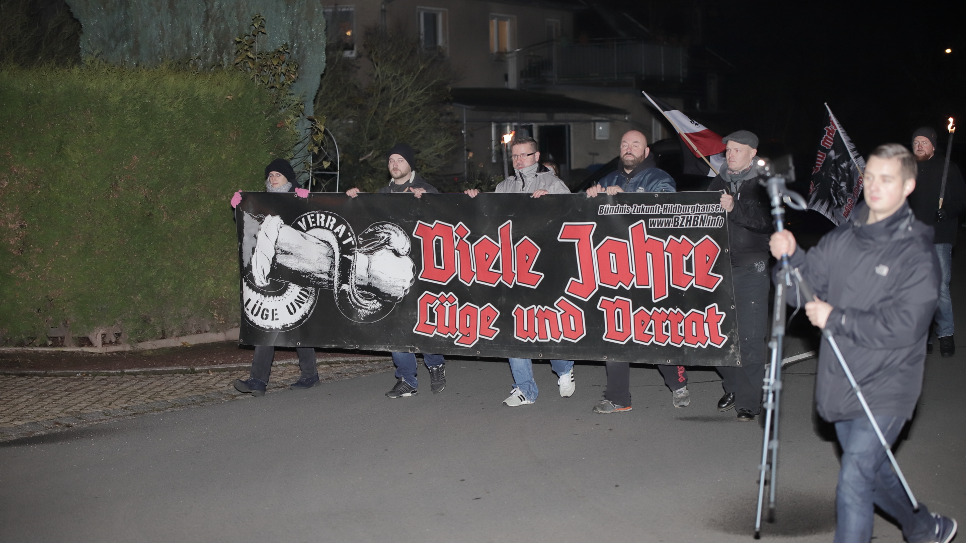 Dagegen – das ist der örtliche Aufmarsch mit rund 90 Teilnehmenden, zu dem sich insbesondere Vertreter der Holocaustleugnerszene versammelten. Sie ist in Thüringen besonders gut organisiert, seit über zehn Jahren pilgert sie nach Schleusingen. Seit Beginn des Jahrzehnts verüben Rechtsextreme in der Stadt gewalttätige Übergriffe, auch hier ist der Fackelmarsch eine jährliche Institution. In diesem Jahr liefen die Neonazis unter dem Namen Bündnis Zukunft Hildburghausen. Gründer der Kleinstpartei ist der Neonazi Tommy Frenck, der Szenefestivals organisiert und Kleidung für Rechtsextreme verkauft.