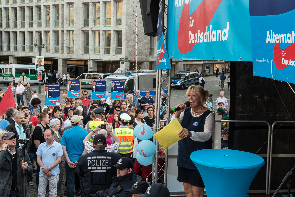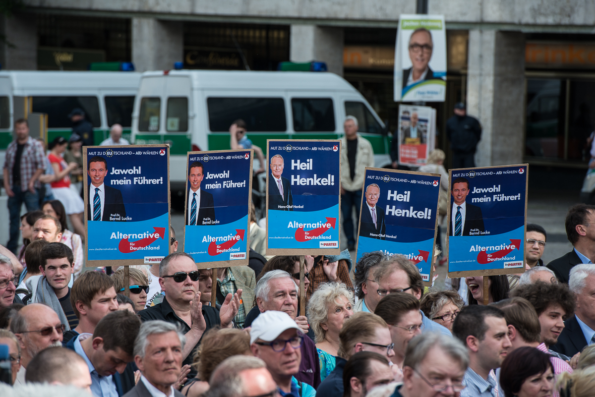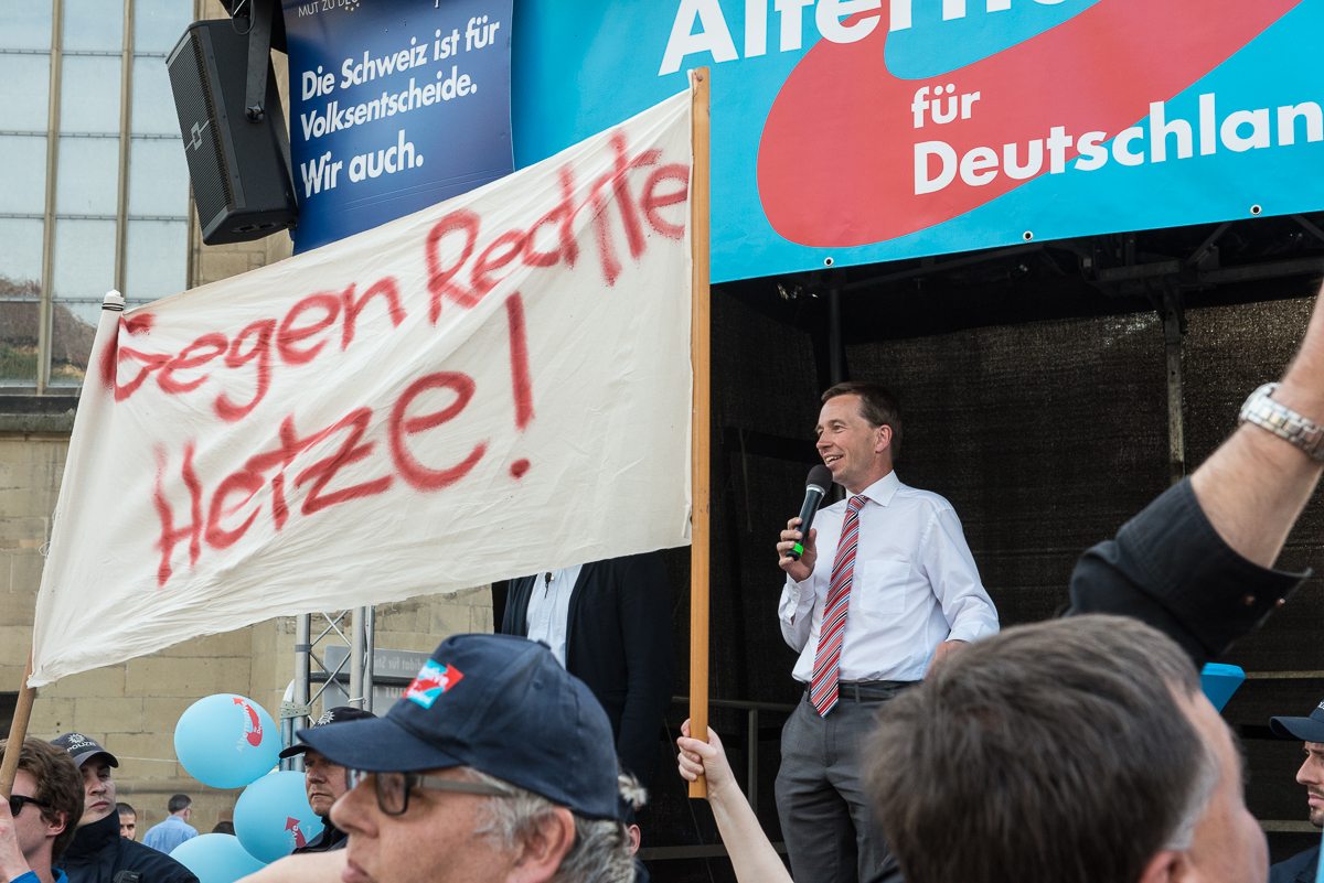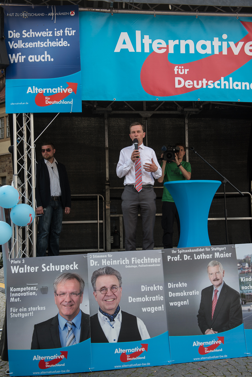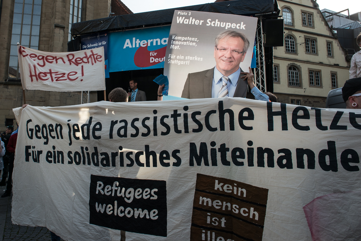 Von einem Pfeifkonzert und lauten Sprechchören begleitet fand am 20.05.2014 eine Wahlkampfveranstaltung der Alternative für Deutschland (AfD) mit Parteichef Bernd Lucke in Stuttgart statt. Gegendemonstranten hatten unter dem Motto „Spuck’ Lucke in die Suppe! Kein Platz für rechte Hetze!“ zur Blockade der Veranstaltung aufgerufen.
