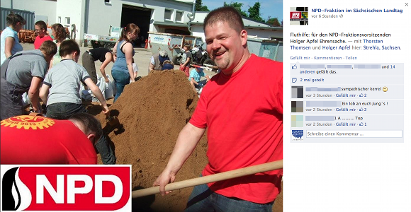 Beim Hochwasser sind nicht nur unzählige Rettungskräfte und eine Vielzahl engagierter freiwilliger Helfer im Einsatz. Auch Neonazis versuchen bedauerlicherweise dieses Thema für ihre menschenverachtenden Zwecke und ihre Kampagnen zu instrumentalisieren. Weiter„Die „Fluthilfe“-Show der NPD“