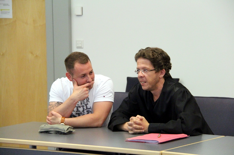 JN-Chef Andy Knape (links) und sein Anwalt Ingmar Knop im Gerichtssaal Foto: Mathias Roth