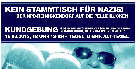 In Berlin kündigen linke Gruppen für den kommenden Freitag Proteste gegen ein Treffen von Rechtsextremisten an. Der NPD Kreisverband plant in der Gaststätte „Zum Kegel“ offenbar erneut eine Sitzung. Unter dem Motto „Kein Stammtisch für Nazis – der NPD in Reinickendorf auf die Pelle rücken!“ ist eine Kundgebung vor der Kneipe angemeldet. Treffpunkt: 15. Februar 2013 | 18:00 | Grußdorf- Ecke Buddestraße (Anfahrt über S-Berlin-Tegel oder U-Alt-Tegel). Mehr Informationen finden Sie hier.