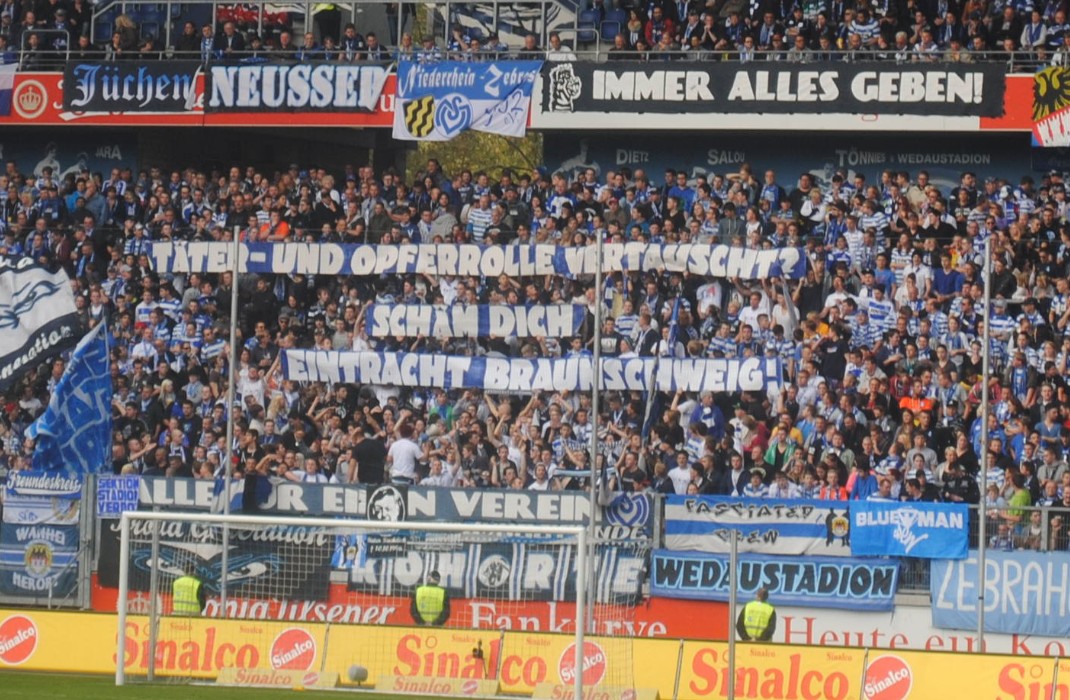 In zahlreichen deutschen Stadien kommt es derzeit zu Auseinandersetzungen zwischen rechtsextremenn Hooligans und antirassistischen Ultras. Beim MSV Duisburg eskaliert der Konflikt nun zunehmend, Neonazis, Hooligans und rechtsoffene Zuschauer attackierten erneut Fangruppierungen, die sich im Stadion gegen Diskriminierung engagieren. Bezeichnend ist auch in diesem Fall wie so oft die angeblich „unpolitische“ Haltung, hinter der sich große Teile der Fanszene verstecken. Weiter„Wie Neonazis in den Stadien antirassistische Fans bedrohen“
