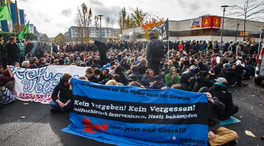 Rund 140 Teilnehmer, mehrheitlich organisierte Neonazis aus Berlin und Brandenburg, versammelten sich am vergangenen Samstag zu einem Aufmarsch gegen die vor wenigen Monaten im Berliner Ortsteil Hellersdorf eröffnete Unterkunft für Asylsuchende. Weit kamen die Rechtsextremen jedoch nicht, da mehrere hundert Gegendemonstranten nach wenigen hundert Metern erfolgreich die Wegstrecke blockierten. Weiter„Erfolgreiche Blockade von rechtem Aufmarsch in Berlin-Hellersdorf“