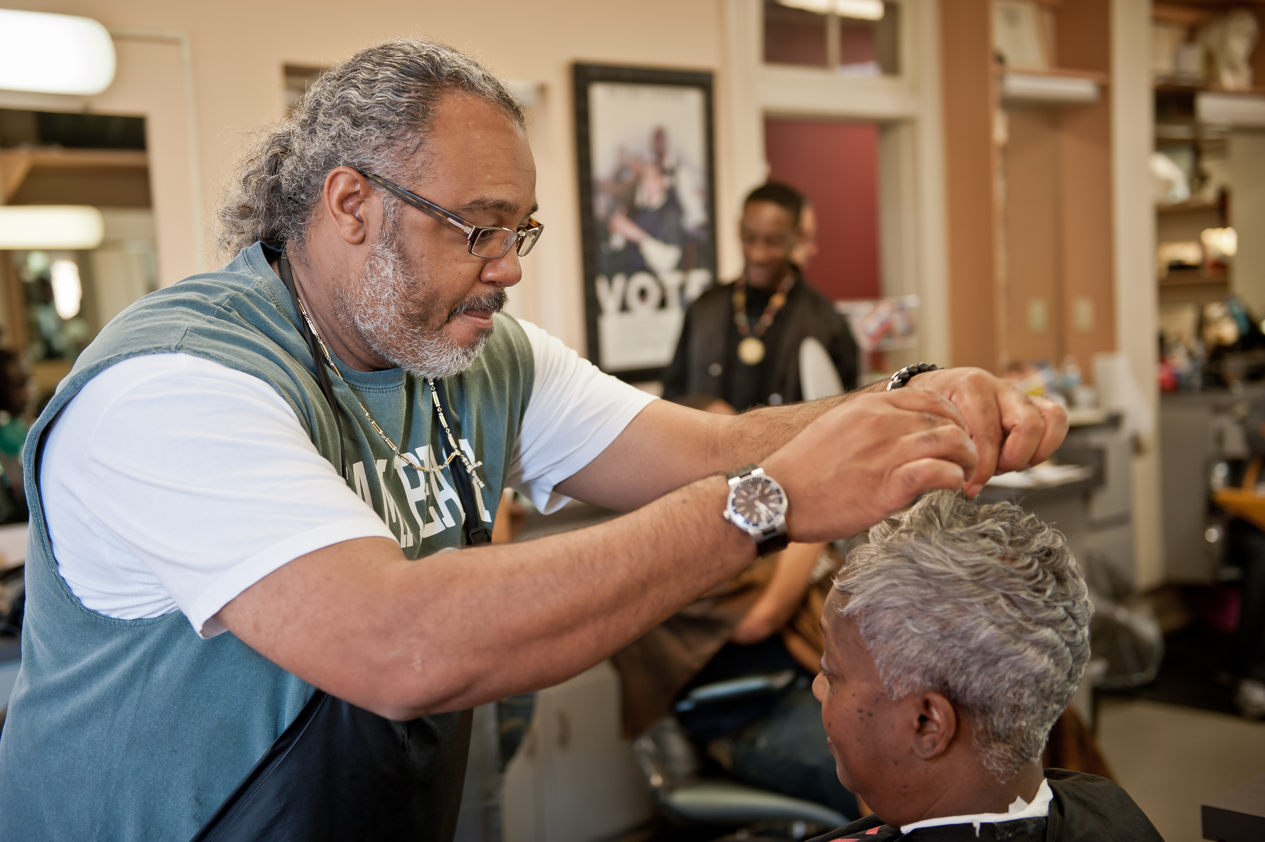 Tony Turners Arbeitstag ist lang. Zwölf Stunden sind es durchschnittlich, es können auch schon mal 16 werden. Da steht er dann im Friseursalon „Haywood’s Hair Images“ in Richmond, Virginia. Turner redet bei der Arbeit gern viel, und es sieht beinahe so aus, als sei der 40-Jährige nur zum Spaß hier. Überhaupt scheint an diesem Ort das hektische Leben vor der Tür zu bleiben. Die Kunden haben nichts dagegen, wenn sie warten müssen. Der Stress des Alltags hat hier nichts verloren. Doch der Politik und der anstehenden Präsidentschaftswahl kann man selbst in „Haywood’s Hair Images“ nicht entkommen.