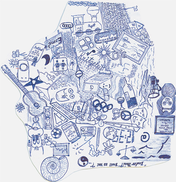 Entstanden ist diese Kritzelei bei einem internationalen Workshop in Berlin zum Thema EU-Recht, -Wirtschaft und -Politikwissenschaften. Nicht dass ich mich gelangweilt hätte, aber diese Themen sind so gradlinig, dass ich Angst hatte, meine Gehirnzellen würden sich in parallelen Reihen anordnen. Und um dies zu vermeiden, habe ich dann kreuz und quer gekritzelt, allerlei kleine Bildchen und Symbole, die mir eingefallen sind. Während einer Pause hat eine Mitstudentin aus dem Kosovo – ich selbst bin ein luxemburgischer Däne – das Blatt geklaut und einige ihrer eigenen Kritzeleien zugefügt. Deshalb sind einige Details am Rande des Werks viel künstlerischer als der Rest.