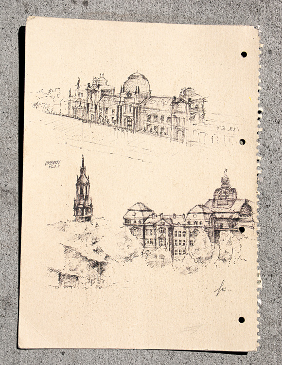 Diese Skizze entstand auf der Rückseite meines College-Blocks, an einem sonnigen Tag in Dresden, wo ich damals studierte. Sie zeigt die wunderschönen Gebäude in der Altstadt und auf der anderen Elbseite. Dennoch erinnert mich die Skizze an eine sehr schwierige Zeit. Kurz zuvor war meine Mutter an einer spontanen Hirnblutung verstorben – dass sie im Koma lag, hatte mir mein Vater zunächst verschwiegen, um meine Vorbereitung aufs Physikum nicht zu gefährden. So musste ich in der Fremde plötzlich mit ihrem Tod fertigwerden. Inzwischen bin ich dank eines Studienplatztausches nach Düsseldorf zu meiner Familie heimgekehrt, aber ich denke bis heute oft an Dresden.