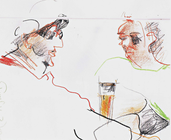 Dieses Gekritzel begleitete kein Telefonat, keinen Vortrag oder dergleichen. Vielmehr saß ich bei einem Kaffee und beobachtete die Leute nebenan. Heimlich, die mit Stiften tätigen Hände unter die Tischplatte geschoben, amüsierte ich mich über die Vielfalt der Kleidung und die schöne Gelöstheit der Cafégäste. Ich durfte mir nichts anmerken lassen – es wäre peinlich gewesen. Vielleicht sogar ein Verstoß gegen den Datenschutz? Eher nicht – dass jemand wiedererkannt wird, steht ja nicht zu befürchten.