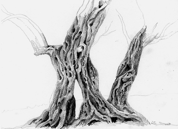 Ein Zeichenausflug mit Freunden führte mich 1974 zu den jahrhundertealten Olivenbäumen in der Nähe von Lefkes auf der Kykladeninsel Paros. Ich folgte mit dem Bleistift den Strukturen des zerklüfteten Stammes. Ein Wunder, dass aus diesem Veteranen immer noch junge Triebe sprießen, dachte ich. Doch die kleinen weißen Blüten zeigten, dass immer noch Oliven reifen würden. Und nun, 40 Jahre später, bei meiner jüngsten Reise nach Paros im Mai 2014, erkenne ich meinen Baum wieder.