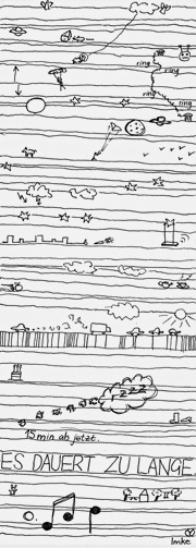 Diese Kritzelei ist an der Uni entstanden. Ich studiere Architektur. In meinem letzten Seminar wurden Referate gehalten, und gleich mehrere Gruppen referierten über dasselbe Thema: Raucherpolitik in weltweit operierenden Firmen. Alle überzogen maßlos. Vor lauter Langeweile fing ich zunächst an, den Block mit Linien zu bemalen. Von Zeit zu Zeit kamen Motive hinzu, und ich stellte meiner Tischreihe flüsternd Rätsel – wie etwa »Wo hat jemand Heimweh?« (Das Marsmännchen) »Was wird gestohlen?« (Der Apfel) »Wer hat keine Probleme zu atmen?« (Das Weltraumschaf, das über einen Versorgungsschlauch mit seiner Heimatwolke verbunden ist). Nachdem meine Gruppe präsentiert hatte, entwickelte sich die Zeichnung immer weiter … Imke Zugermeier, Berlin