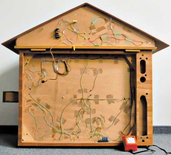 Vor 40 Jahren baute ich für meine Kinder ein Puppenhaus mit Beleuchtung. Die Verkabelung auf der Rückseite entspricht zwar nicht ganz der Ästhetik einer modernen Platine – so ersetzt Paketklebeband die Lötpunkte –, sie ist aber bis zum heutigen Tag voll funktionsfähig. Alle Räume sind mit Lichtschaltern, Lampen und Steckdosen aus- gestattet, beleuchteter Fernseher inklusive. Boden, Decke und Außenwände der beiden unteren Stockwerke sind das ehemalige (Holz-!)Chassis eines ausrangierten Fernsehers. Man erkennt noch die Aussparungen für die Bedienknöpfe, denn die Vorderfront des Fernsehers wurde beim Puppenhaus zur Rückseite. Und was mich als Erbauer besonders freut: Bei meinen Enkeln kommt das Haus seit Jahren wieder zu hoher Ehre!