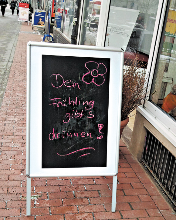 Der Winter ist zurückgekehrt. Vor einem Blumenladen habe ich diese Tafel gesehen. Der Frühling versteckt sich. Man kann ihn finden, man muss ihn nur an den richtigen Stellen suchen…