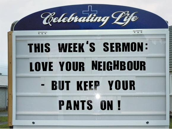 Die Neuseeländer sind einfach lockerer: Vor einer kleinen Kirche in Kaikoura weist ein Schild auf das Thema des nächsten Gottesdienstes hin. Das Augenzwinkern im Titel macht Laune, dabei zu sein.