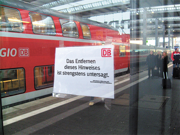 Meine Freundinnen und Freunde behaupten, ich klebte überall überflüssige Hinweiszettel an. Stimmt aber gar nicht. Und auf diese grandiose sinnfrei-dadaistische Idee für einen Hinweiszettel, wie ich ihn am Münchner Hauptbahnhof sah, wäre ich nie gekommen. Der Bahn hätte ich so was Poetisches gar nicht zugetraut! Beim Weitergehen sah ich dann: Es ist nur die Rückseite eines Zettels mit der Aufschrift »Tür bitte immer schließen« an der Innenseite einer weiterverwendeten Telefonzelle, die irgendwelche Technik auf dem Bahnsteig beherbergt.