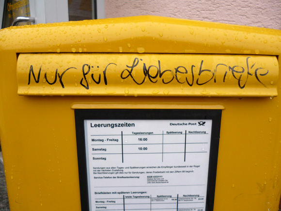Dieses Foto habe ich am Arkonaplatz in Berlin aufgenommen. Ein Spanisch sprechendes Pärchen blieb ebenfalls stehen. Der Mann erklärte der Frau den Schriftzug. Wir lächelten uns an.