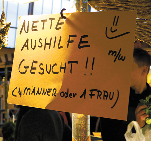 Gerade jetzt, im Geschenke- beziehungsweise Umtauschrummel, sind offenbar multitaskingfähige Mitarbeiter gefragt: Eine Frau ersetzt vier Männer! Wir haben es doch immer gewusst… Gesehen in der Frankfurter Kleinmarkthalle.