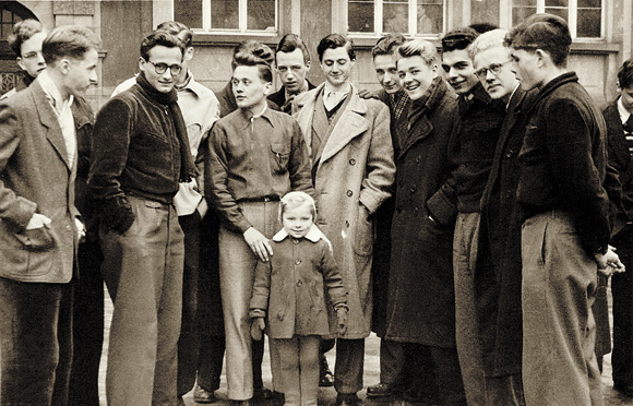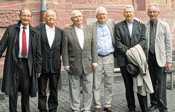 Das linke Foto zeigt unsere Oberprima auf dem Schulhof der Liebig-Schule, des städtischen Realgymnasiums für Jungen in Frankfurt am Main. Etwa ein Vierteljahr vor dem Abitur hatten wir uns während der Pause zum Gruppenbild aufgestellt. Der Sohn unseres Klassenlehrers spielte gerade draußen und wollte unbedingt mit aufs Bild. Auf dem rechten Foto sieht man uns – besser gesagt: die verbliebenen sechs – am gleichen Ort während des Abi-Treffens 60 Jahre später. Wir haben intensive Stunden miteinander verbracht, und auch wenn wir nicht dauernd von früher redeten, wurde uns der Zeitsprung von damals zur Gegenwart sehr bewusst. Erst nach zwei Tagen trennten wir uns – dankbar auch für die Zeit mit denen, die beim Abi-Treffen nicht mehr dabei waren.