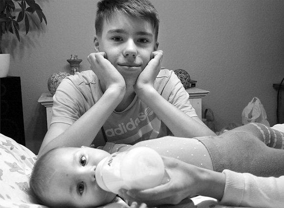 Auf dem Bild links, das vor 41 Jahren entstand, wacht mein neun Jahre älterer Bruder Roland über mich. 2013 hatte ich das Glück, zum zweiten Mal Mutter zu werden. Und nun wacht mein fast 13 Jahre alter Sohn James über seine kleine Schwester Mila Matilda. Das ganze Gerede vom zu großen Altersabstand ist für mich unverständlich. Ich hatte ein Leben lang einen Beschützer, meinen GROSSEN Bruder. Und wie man sieht, wiederholt sich alles: Mein Sohn liebt seine kleine Schwester und geht auf in seiner Rolle als GROSSER Bruder.